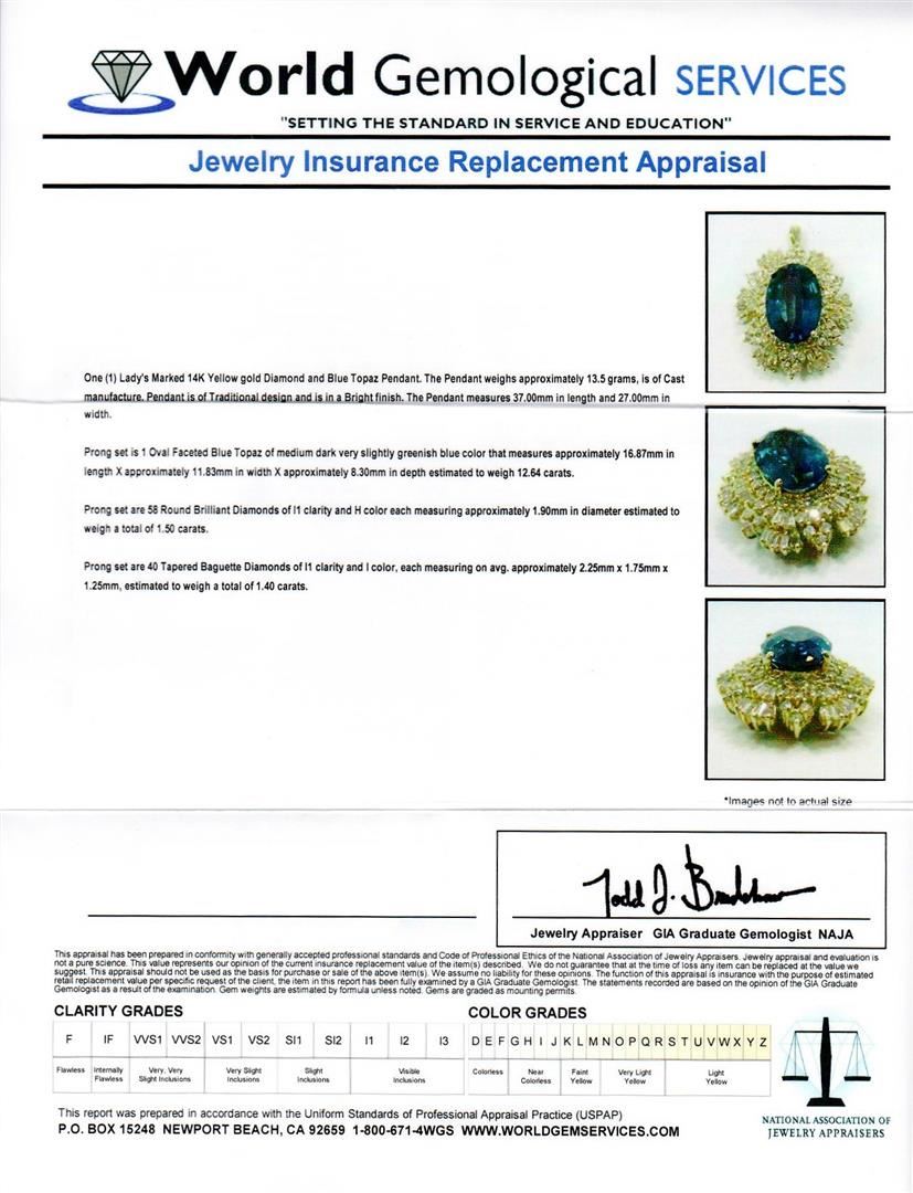 One 14KT Yellow Gold 12.64ct Blue Topaz and Diamond Pendant with a total weight of 13.4 grams. Blue Topaz total weight of 12.64cts. (58) rounds diamonds with a total weight of 1.50cts with a color of (H) and clarity of I-1. (40) baguette diamonds with a total weight of 1.40cts with a color of (I) and clarity of (I-1).