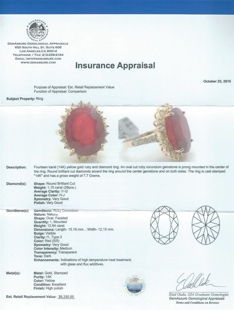 14KT yellow gold ruby and diamond ring. An oval cut ruby corundum gemstone weighing in at an aproximate 12.64 carats is prong mounted in the center of the ring. Approximately 1.15 carats of round brilliant cut diamonds accent the ring around the center gemstones and on both sides. The ring is cast stamped "14K" and has a gross weight of 7.7 grams. The diamond have an average clarity of I1-I2. Ruby color red, intensity is medium. Finish: High polish. Condition: Excellent GGA Appraised at $6,330.00.