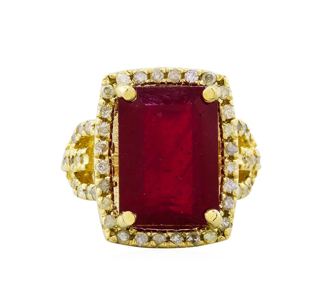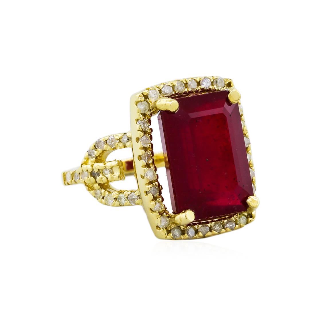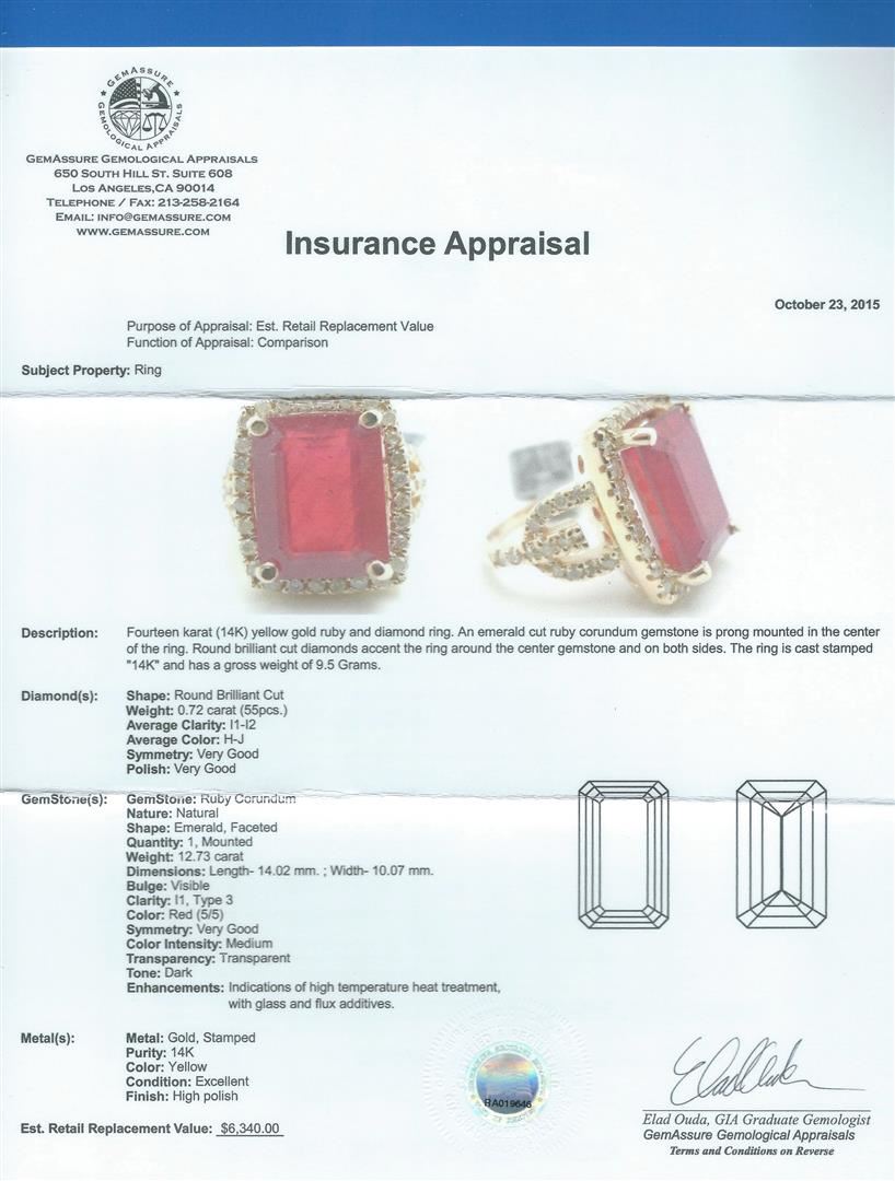 14KT yellow gold ruby and diamond ring. An emerald cut natural ruby corundum gemstone weighing in at an aproximate 12.73 carats is prong mounted in the center of the ring. Approximately 0.12 carats of round brilliant cut diamonds accent the ring around the center gemstones and on both sides. The ring is cast stamped "14K" and has a gross weight of 9.5 grams. The diamonds have an average clarity of I1-I2. Ruby color is red, intensity is medium. Finish: High polish. Condition: Excellent GGA Appraised at $6,340.00.
