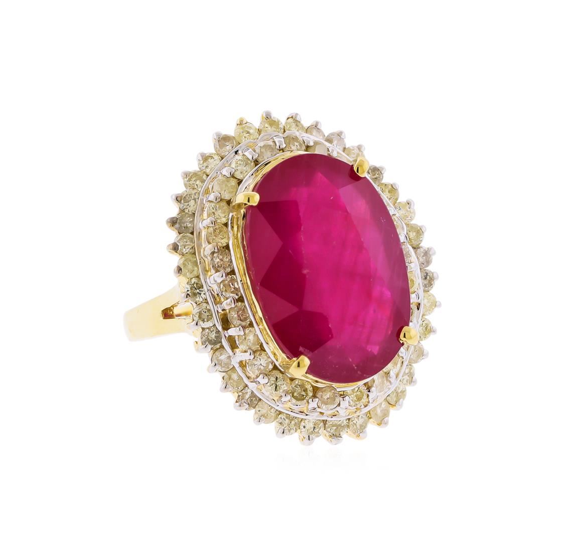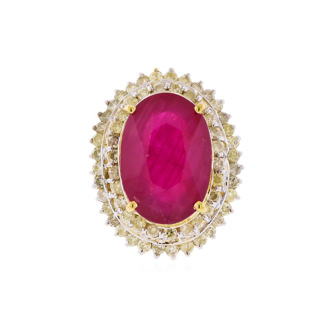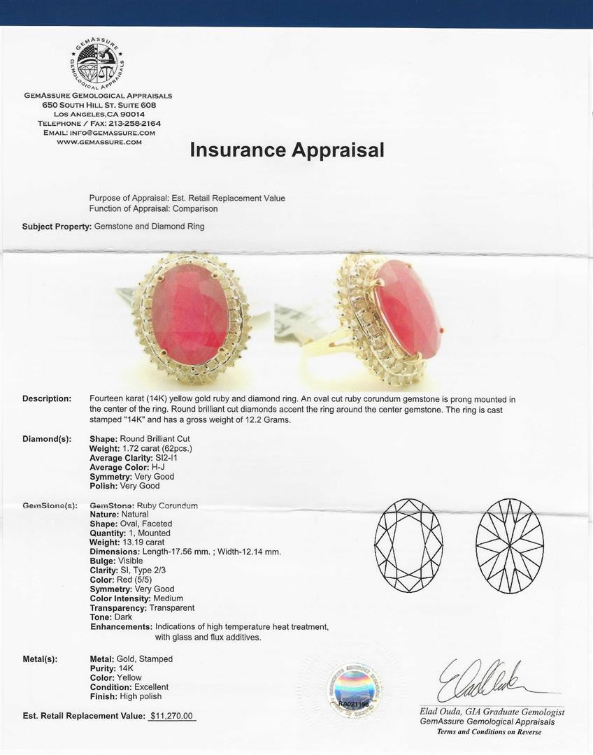 One fourteen karat (14K) yellow gold ruby and diamond ring. An oval cut ruby corundum gemstone weighing 13.19 carats is prong mounted in the center of the ring. Sixty-two round brilliant cut diamonds with an average clarity of SI2-I1, average color of H-J, weighing 1.72 carats accent the ring around the center gemstone. The ring is cast stamped "14K" and has a gross weight of 12.2 Grams. GGA Appraised at $11,270.00.