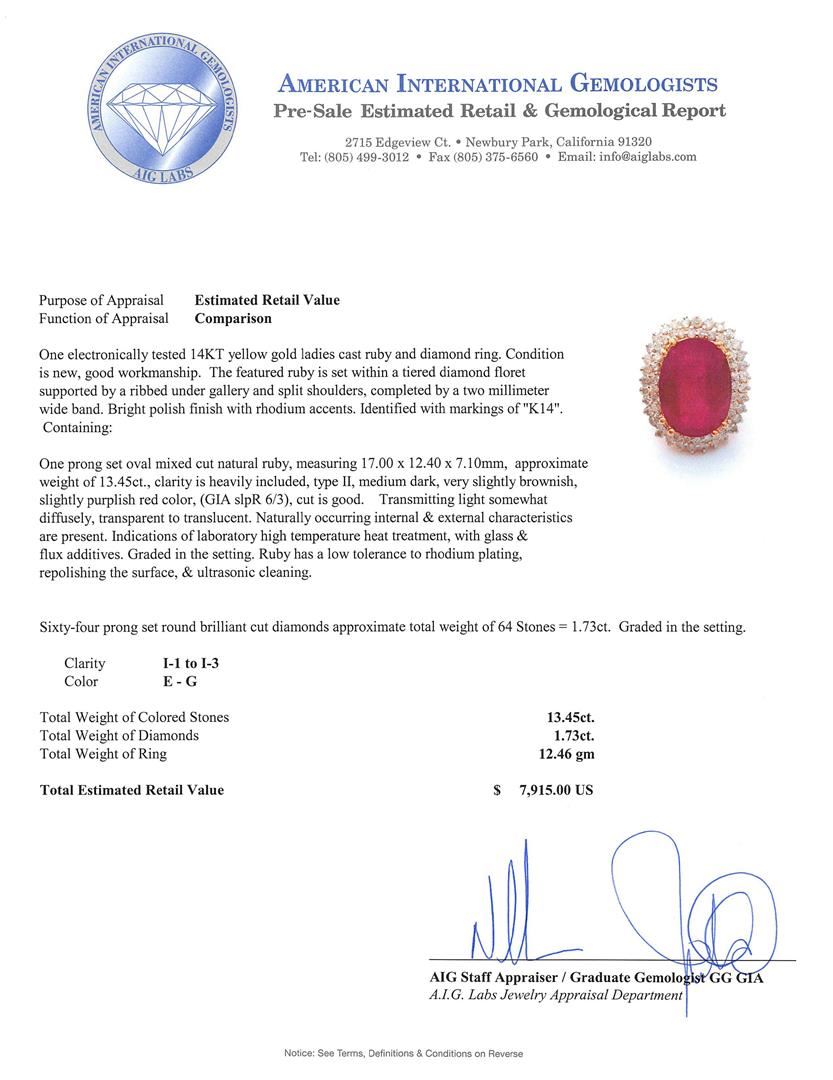 One electronically tested 14KT yellow gold ladies cast ruby and diamond ring. The featured ruby is set within a tiered diamond floret supported by a ribbed under gallery and split shoulders, completed by a two millimeter wide band. Bright polish finish with rhodium accents. Identified with markings of "K14". Condition is new, good workmanship. Containing: One prong set oval mixed cut natural ruby, measuring 17.00 x 12.40 x 7.10mm, approximate weight of 13.45ct., clarity is heavily included, type II, medium dark, very slightly brownish, slightly purplish red color, (GIA slpR 6/3), cut is good. Transmitting light somewhat diffusely, transparent to translucent. Naturally occurring internal & external characteristics are present. Indications of laboratory high temperature heat treatment, with glass & flux additives. Graded in the setting. Ruby has a low tolerance to rhodium plating, repolishing the surface, & ultrasonic cleaning. Sixty-Four prong set round brilliant cut diamonds approximate total weight of 64 Stones = 1.73ct. Graded in the setting. Clarity: I-1 to I-3. Color: E - G. Total Weight of Colored Stones 13.45ct. Total Weight of Diamonds 1.73ct. Total Weight of Ring 12.46gm. AIG Appraised at $7,915.00.