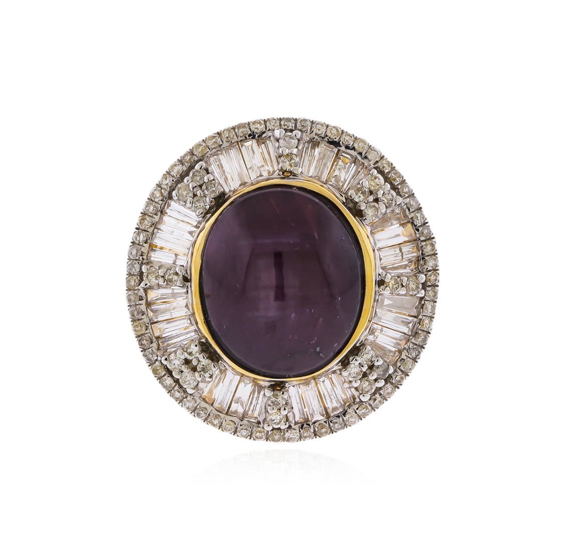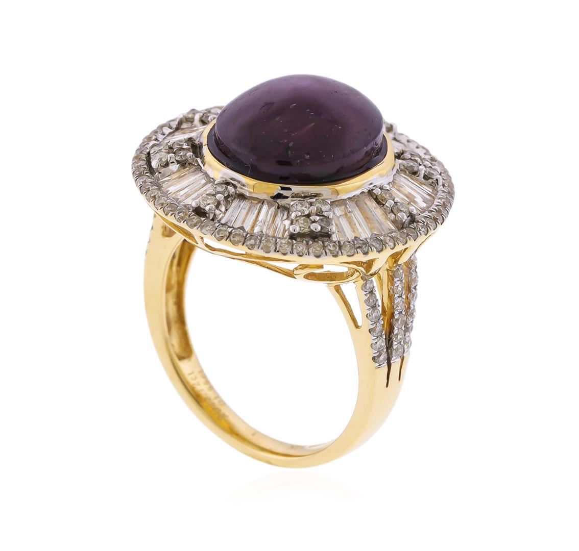 One fourteen Karat (14KT) yellow gold Star ruby and diamond ring. An oval cabochon cut star ruby corundum gemstone weighing 13.72 carats is prong mounted in the center of the ring. Baguette and round brilliant cut diamonds, average clarity of SI2-I1, average color of H-I, weighing 1.55 carats accent the ring around on both sides of the center gemstone. The ring is cast stamped "14K" and has a gross weight of 11.8 Grams. GGA Appraised at $9,460.00.