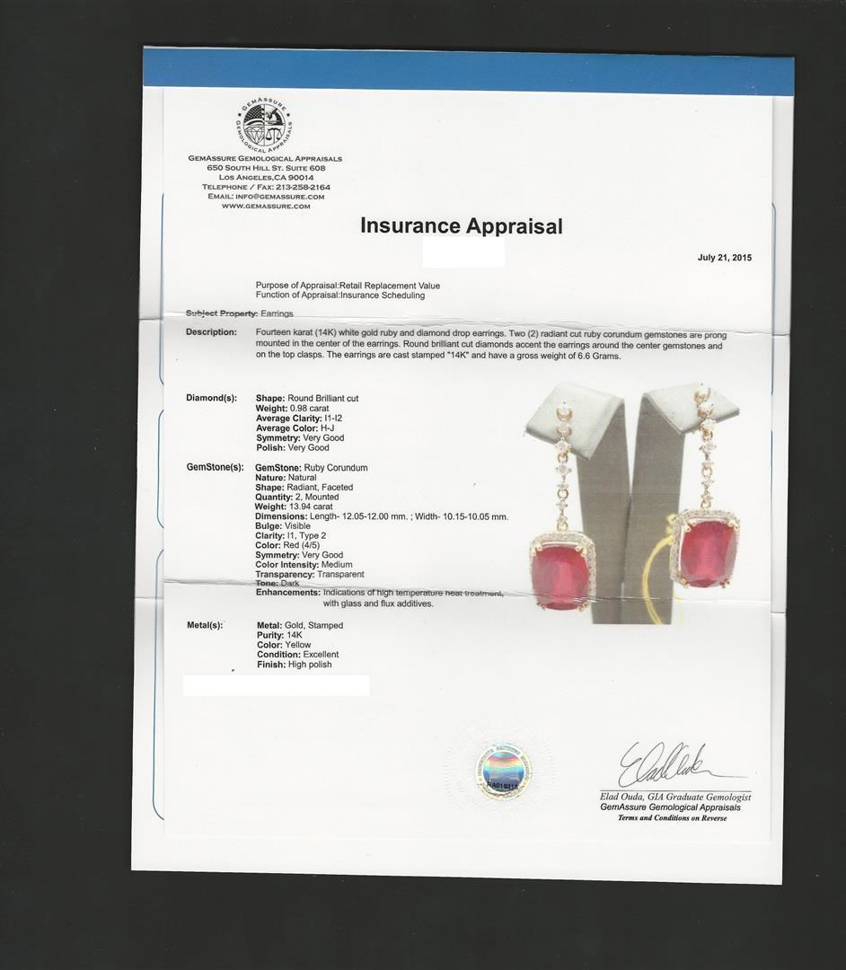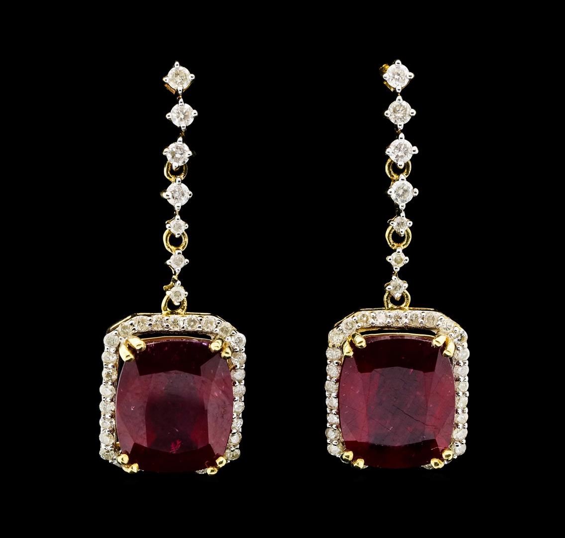 14KT white gold ruby and diamond drop earrings. TWO (2) radiant ruby corundum mounted in the center of the earrings. Round brilliant cut diamonds accent the earrings around the center gemstones and on the top clasps. The earrings are cast stamped "14K" and have a gross weight of 6.6 grams. Diamonds with a total weight of 0.98cts with a clarity of I1-I2 and color of H-J. 2 rubies with a total weight of 13.94cts. GA Appraised.