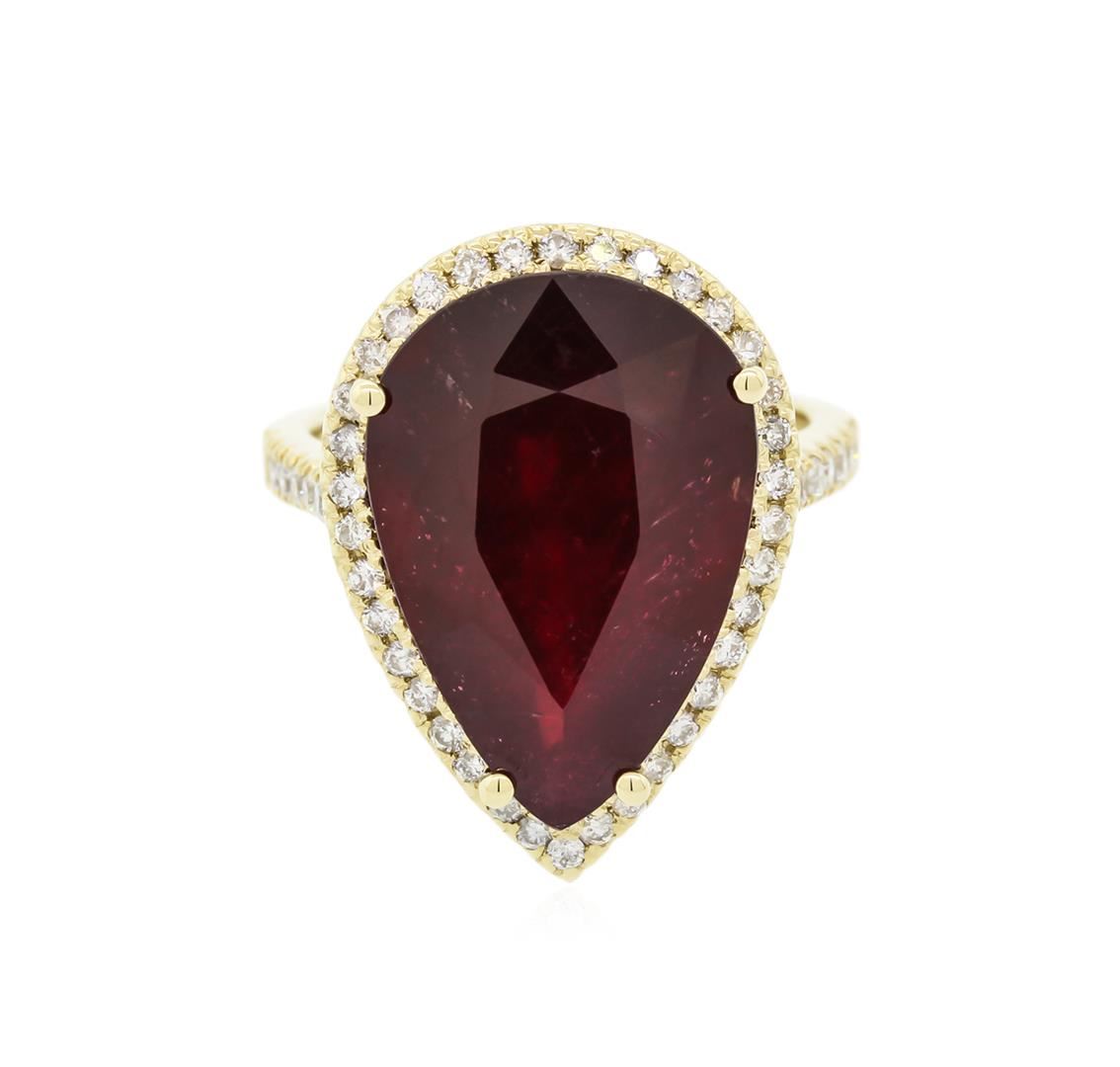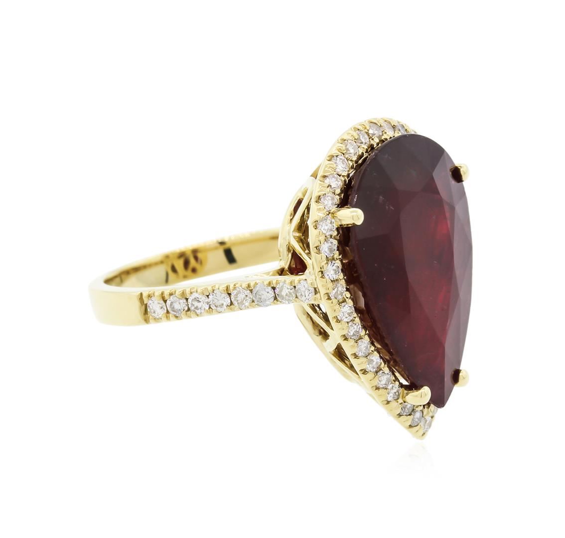 One electronically tested 14KT yellow gold lady's cast fashion ring with a basket halo with a bright polish finish. The featured lady's ring has a shank measuring 2.50 millimeters in width. Identified with markings of "K14". Condition is new, good workmanship. Containing: One prong set pear modified brilliant cut natural ruby, measuring 18.52 x 12.53 x 7.50mm, approximate weight of 13.98ct., clarity is heavily included, type II, dark, very slightly brownish, orangy red color, (GIA oR 7/3), cut is good. Transmitting light somewhat diffusely, semi-transparent to translucent. Naturally occurring internal & external characteristics are present. Indications of laboratory high temperature heat treatment, with glass & flux additives. Graded in the setting. Sixteen split prong set round brilliant cut diamonds, measuring 1.60 - 1.50 x 1.01mm (depth est.) approximate total weight of 16 Stones = 0.25ct. Graded in the setting. Clarity: SI-1 to I-1. Color: H - I. Cut Good Thirty-Six split prong set round brilliant cut diamonds, measuring 1.40 - 1.30 x 0.81mm (depth est.) approximate total weight of 36 Stones = 0.33ct. Graded in the setting. Clarity: SI-1 to I-1. Color: H - I. Cut Good. Total Weight of Colored Stones 13.98ct. Total Weight of Diamonds 0.58ct. Total Weight of Ring 8.60gm. GAS Appraised at $6,350.00.