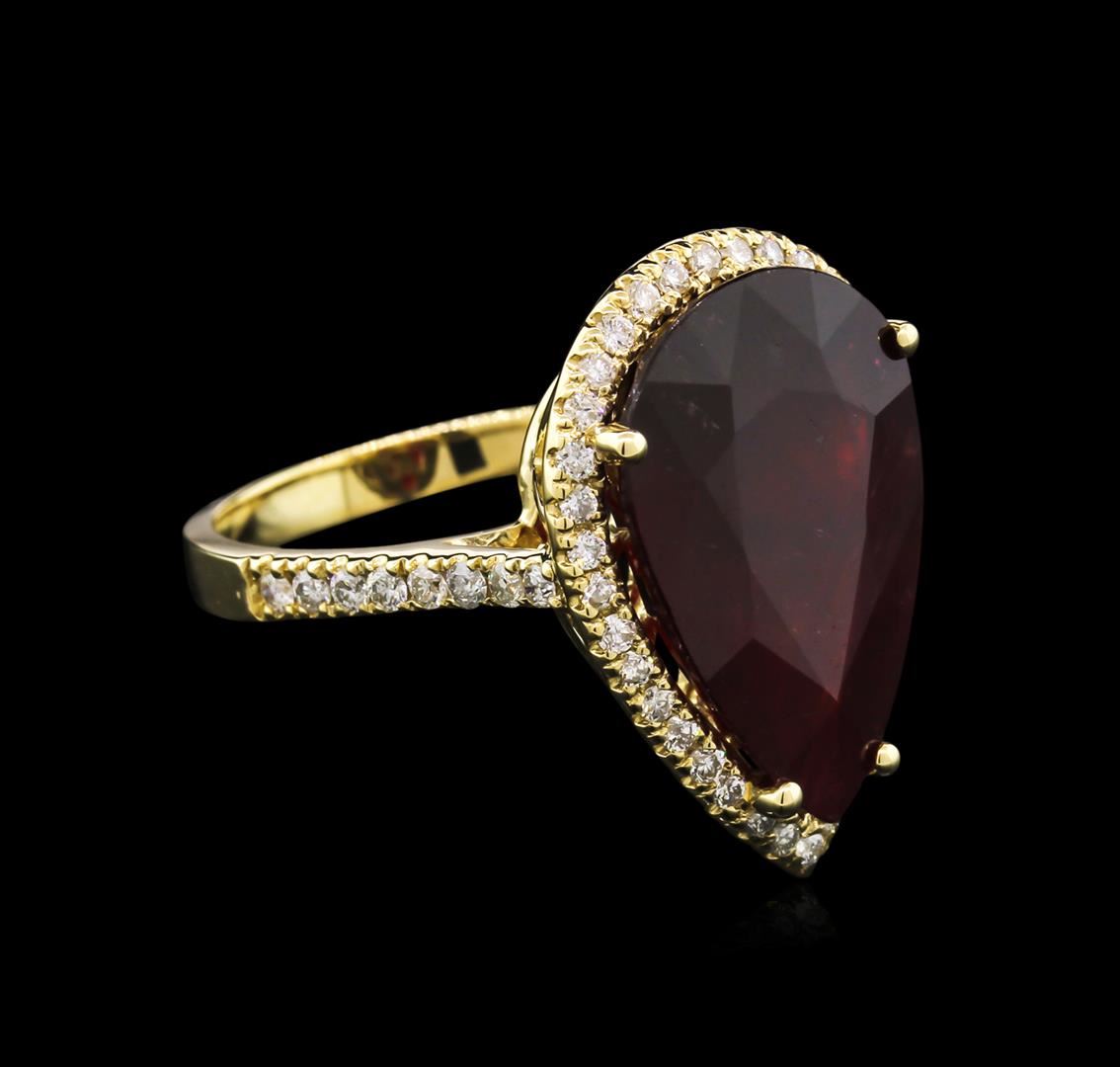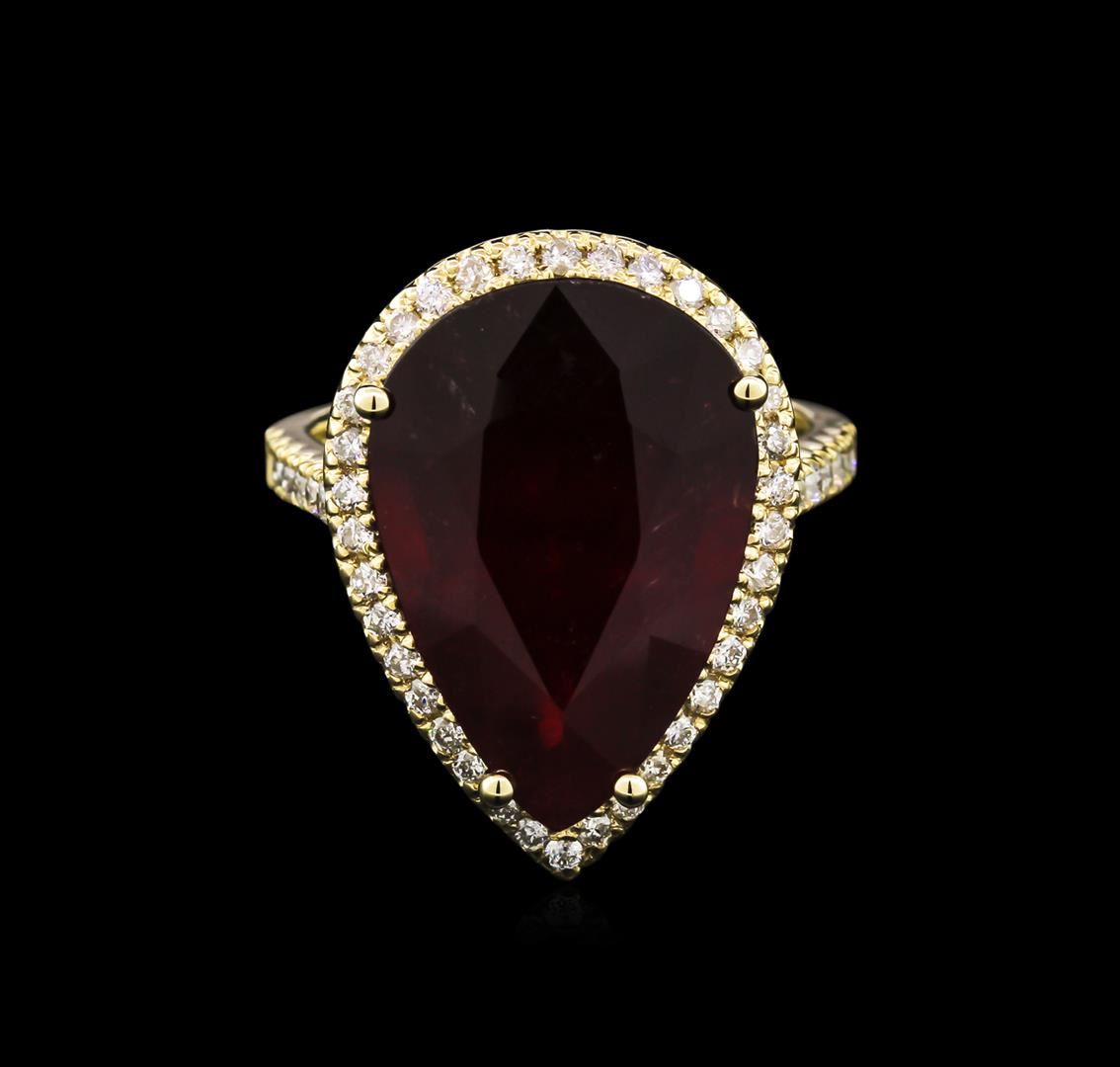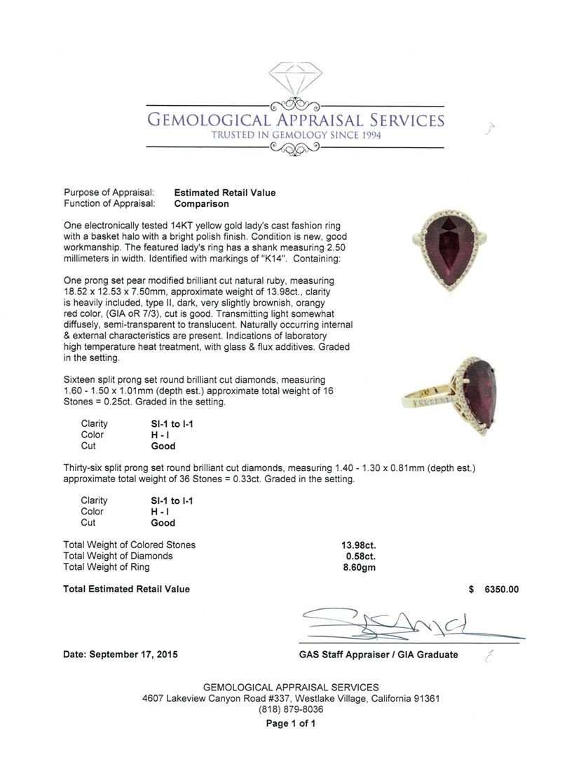 One electronically tested 14KT yellow gold lady's cast fashion ring with a basket halo with a bright polish finish. The featured lady's ring has a shank measuring 2.50 millimeters in width. Identified with markings of "K14". Condition is new, good workmanship. Containing: One prong set pear modified brilliant cut natural ruby, measuring 18.52 x 12.53 x 7.50mm, approximate weight of 13.98ct., clarity is heavily included, type II, dark, very slightly brownish, orangy red color, (GIA oR 7/3), cut is good. Transmitting light somewhat diffusely, semi-transparent to translucent. Naturally occurring internal & external characteristics are present. Indications of laboratory high temperature heat treatment, with glass & flux additives. Graded in the setting. Sixteen split prong set round brilliant cut diamonds, measuring 1.60 - 1.50 x 1.01mm (depth est.) approximate total weight of 16 Stones = 0.25ct. Graded in the setting. Clarity: SI-1 to I-1. Color: H - I. Cut Good Thirty-Six split prong set round brilliant cut diamonds, measuring 1.40 - 1.30 x 0.81mm (depth est.) approximate total weight of 36 Stones = 0.33ct. Graded in the setting. Clarity: SI-1 to I-1. Color: H - I. Cut Good. Total Weight of Colored Stones 13.98ct. Total Weight of Diamonds 0.58ct. Total Weight of Ring 8.60gm. GAS Appraised at $6,350.00.