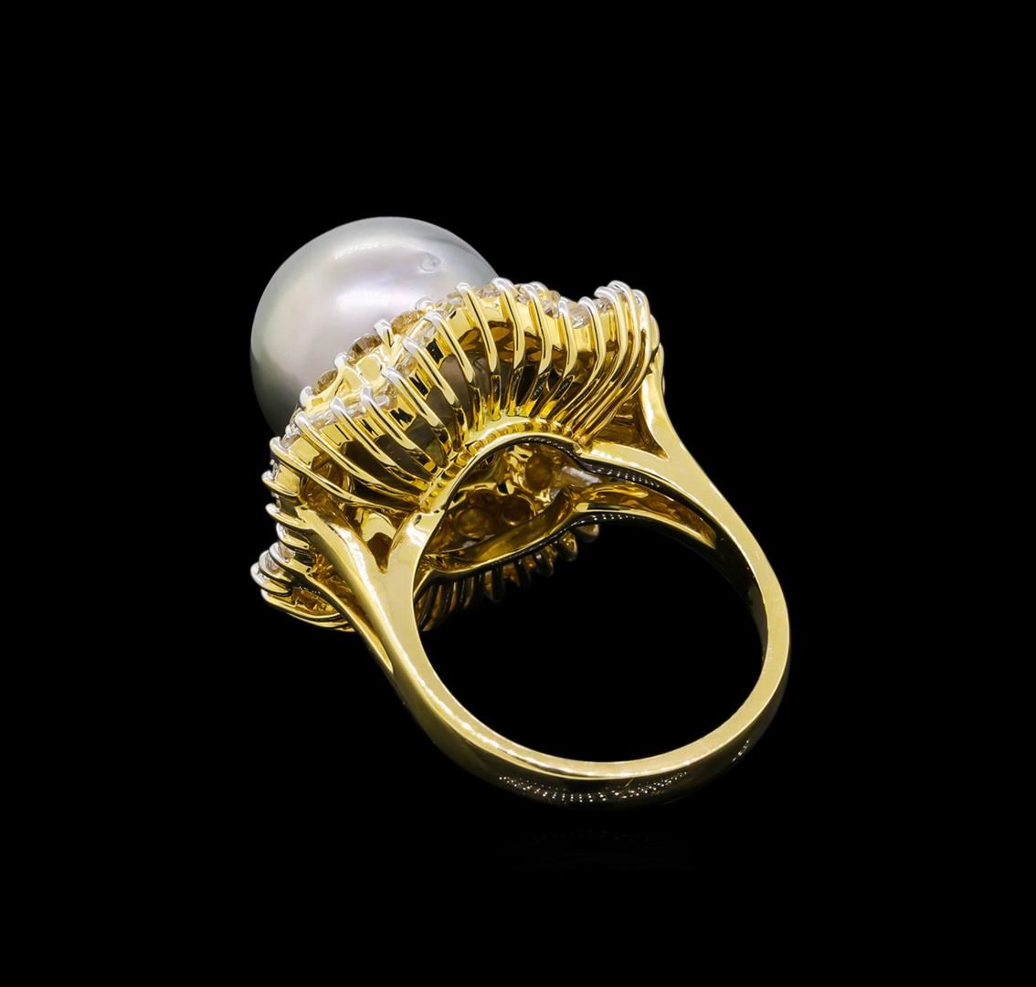 One electronically tested 14KT yellow gold lady's cast fashion ring with a double basket halo with a bright polish finish. The featured lady's ring has a shank measuring 3.02 millimeters in width. Identified with markings of "14K". Condition is new, good workmanship. Containing: Twenty-Two prong set round brilliant cut diamonds, measuring 2.10 - 2.00 x 1.27mm (depth est.) approximate total weight of 22 Stones = 0.75ct. Graded in the setting. Clarity: VS-2 to SI-1. Color: H - ICut Good Forty-Two prong set baguette cut (tapered) diamonds, measuring from 1.80 x 1.50 x 1.28mm (depth est.) to 2.60 x 1.90 x 1.62mm (depth est.) approximate total weight of 42 Stones = 2.05ct. Graded in the setting. Clarity: VS-2 to SI-1. Color: G - ICut Very Good One south sea cultured pearl, 13.6mm to 13.4mm in size. The pearl is black in color, faint green overtone with a good luster, near round, and mostly clean. Graded in the setting. Total Weight of Diamonds 2.80ct. Total Weight of Ring 14.00gm. GAS Appraised.