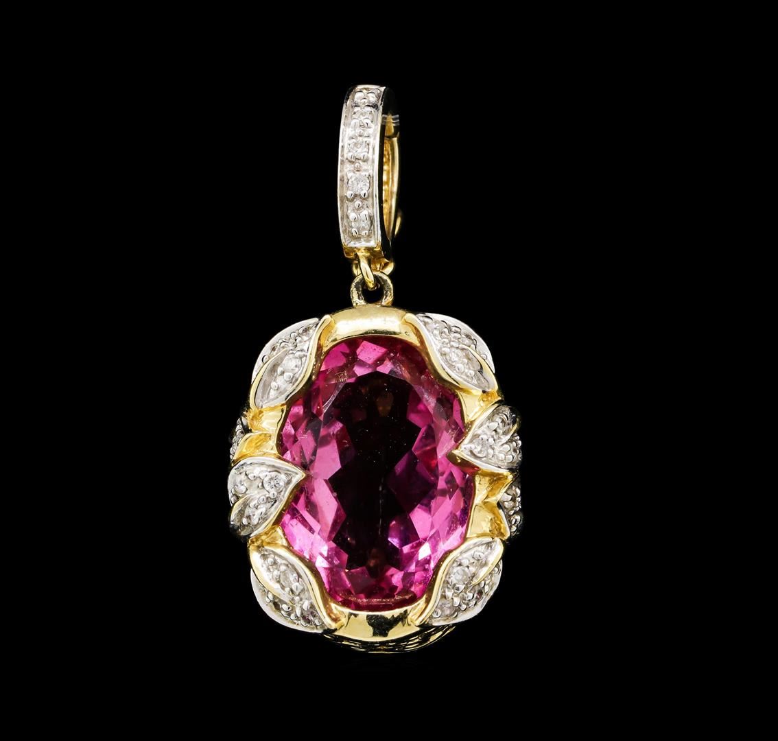 One electronically tested 14KT yellow with rhodium plating gold lady's combination cast & assembled fashion floral design pendant-enhancer with a bright polish finish. Identified with markings of "14K 585". Condition is new, good workmanship. Containing: One prong set oval modified brilliant cut natural pink topaz, measuring 18.00 x 13.00 x 8.63mm, (depth est.) approximate weight of 14.00ct., clarity is eye clean, medium, moderately strong, slightly purplish red color, (GIA slpR 5/4), cut is very good. Transmitting light with no distortion, transparent. Colored gemstones are presumed to have been subjected to commonly used enhancement processes. Graded in the setting.Twenty-Nine prong set round brilliant cut diamonds, measuring 1.30 - 1.20 x 0.78mm (depth est.) approximate total weight of 29 Stones = 0.22ct. Graded in the setting. Clarity: SI-1 to I-1. Color: I - JCut Good. Total Weight of Colored Stones 14.00ct. Total Weight of Diamonds 0.22ct. Total Weight of Pendant-Enhancer 9.40gm. GAS Appraised.