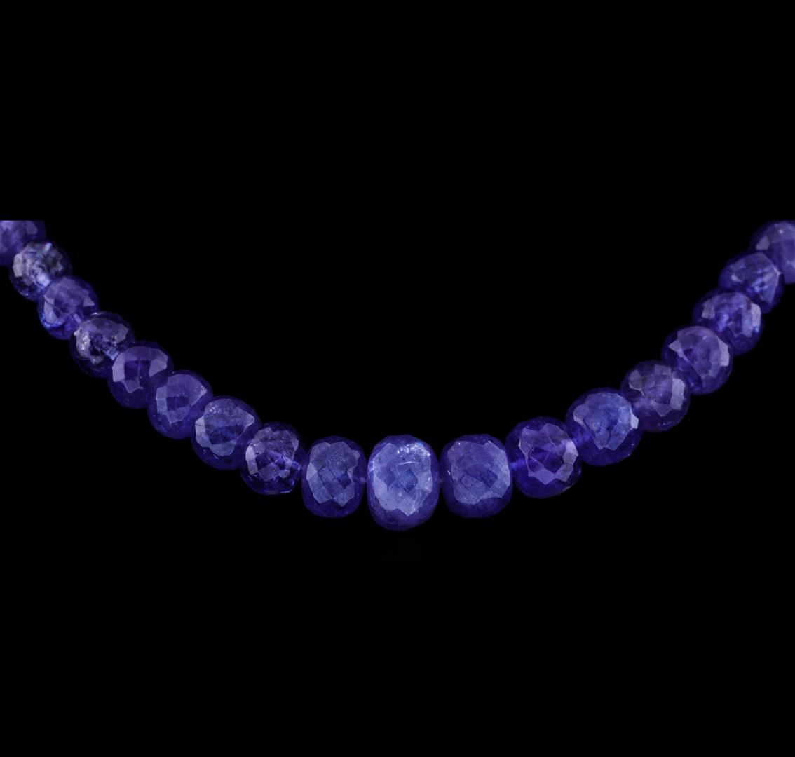 One electronically tested 14KT yellow gold lady's combination cast & assembled fashion necklace with a hook clasp with a bright polish finish. The featured lady's necklace contains graduated tanzanite briolette's, with the largest in the center and the smallest near the clasp. The necklace measures approximately 18.25 inches in length. Identified with markings of "585". Condition is new, good workmanship. Containing: Ninety-one briolette cut natural tanzanites, measuring 9.40 x 5.25 x 3.42mm, (depth est.) approximate total weight of 143.00ct., clarity is heavily included, medium light, very slightly grayish, bluish violet color, (GIA bV 4/3), cut is good. The featured tanzanites are cut into briolette beads. Transmitting light somewhat diffusely, semi-transparent to translucent. Colored gemstones are presumed to have been subjected to commonly used enhancement processes. Graded in the setting. Total Weight of Colored Stones143.00ct. Total Weight of Necklace 35.50gm. GAS Appraised.