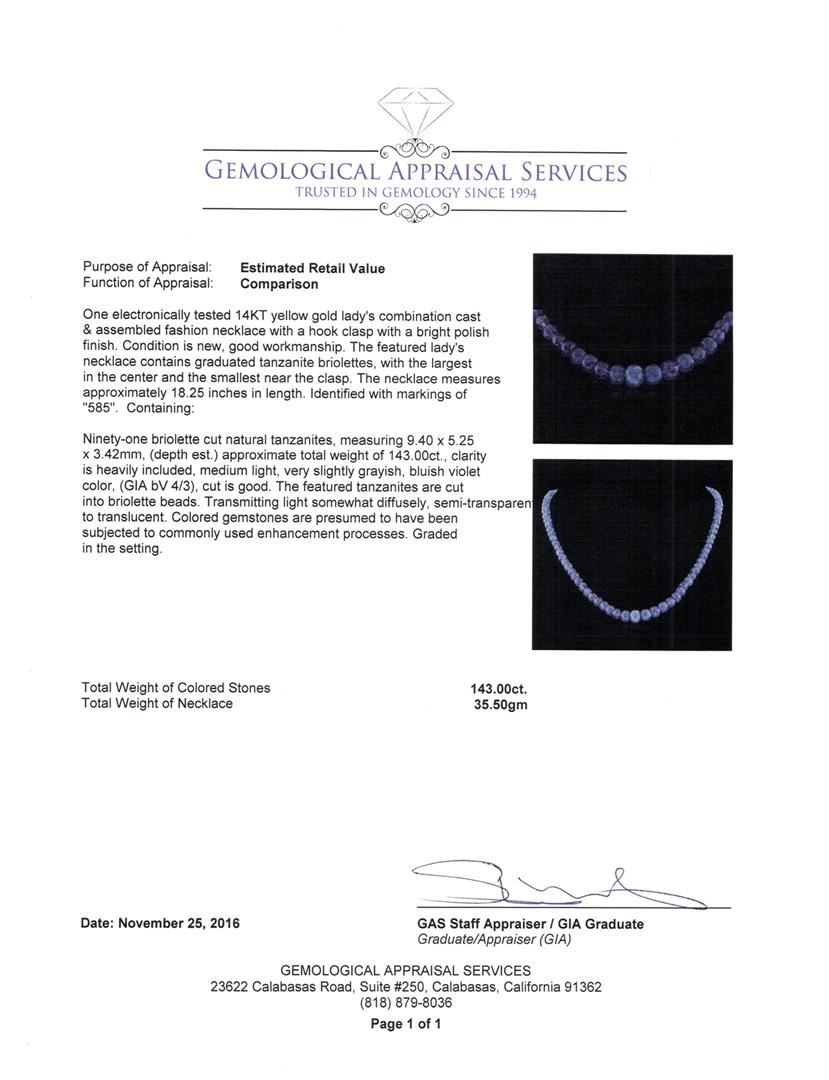 One electronically tested 14KT yellow gold lady's combination cast & assembled fashion necklace with a hook clasp with a bright polish finish. The featured lady's necklace contains graduated tanzanite briolette's, with the largest in the center and the smallest near the clasp. The necklace measures approximately 18.25 inches in length. Identified with markings of "585". Condition is new, good workmanship. Containing: Ninety-one briolette cut natural tanzanites, measuring 9.40 x 5.25 x 3.42mm, (depth est.) approximate total weight of 143.00ct., clarity is heavily included, medium light, very slightly grayish, bluish violet color, (GIA bV 4/3), cut is good. The featured tanzanites are cut into briolette beads. Transmitting light somewhat diffusely, semi-transparent to translucent. Colored gemstones are presumed to have been subjected to commonly used enhancement processes. Graded in the setting. Total Weight of Colored Stones143.00ct. Total Weight of Necklace 35.50gm. GAS Appraised.