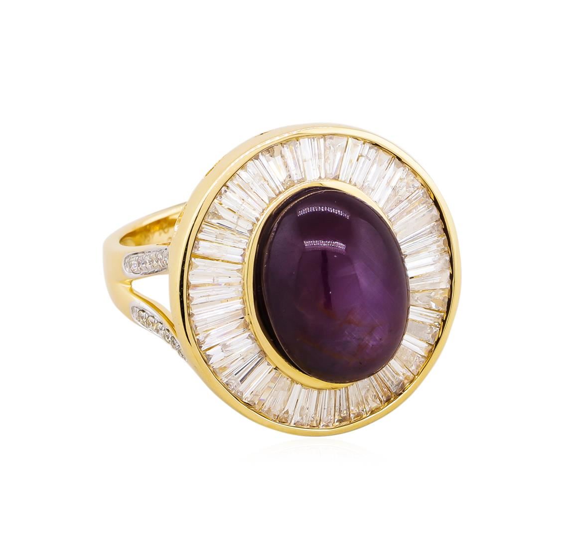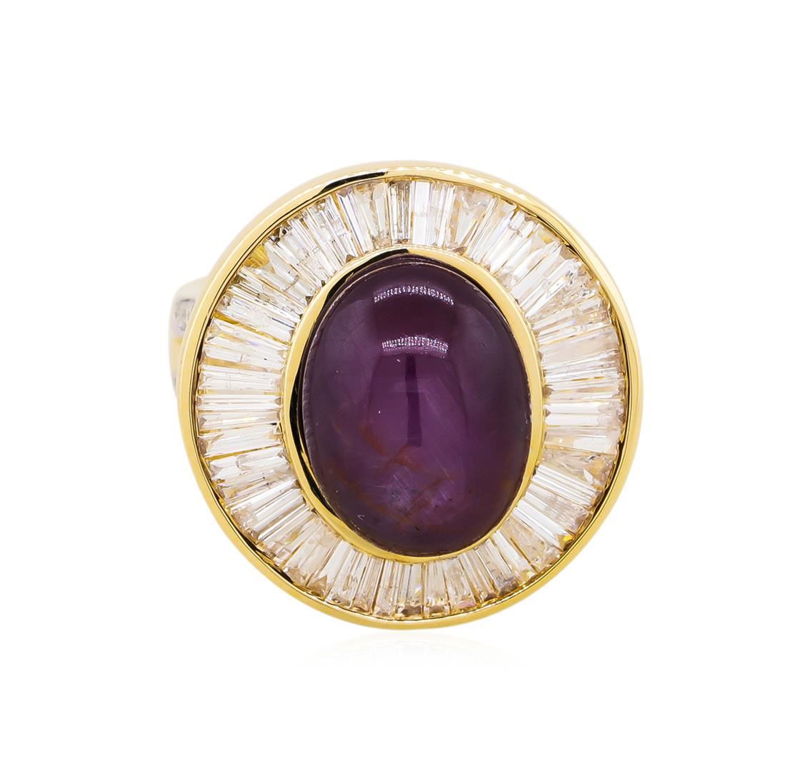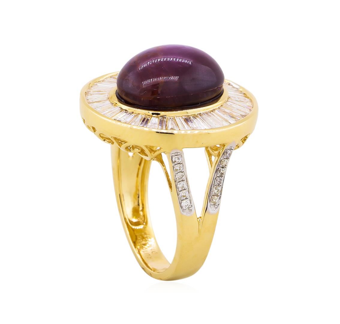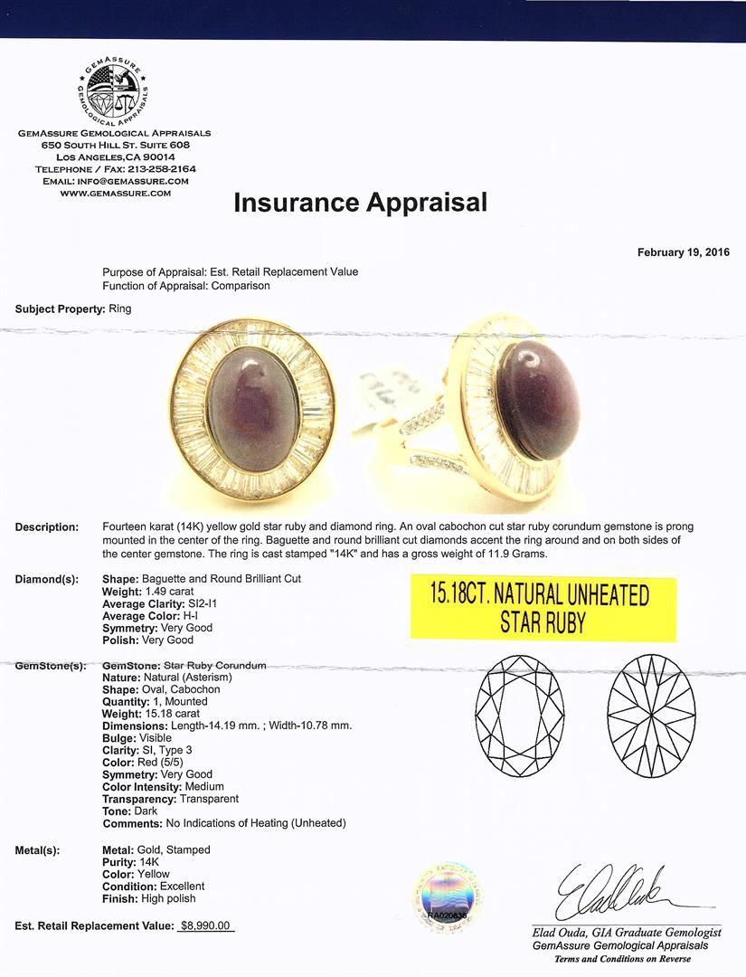 Fourteen Karat (14K) Yellow Gold Star Ruby And Diamond Ring. An Oval Cabochon Cut Star Ruby Corundum Gemstone Is Prong Mounted In The Center Of The Ring. Baguette And Round Brilliant Cut Diamonds Accent The Ring Around And On Both Sides Of The Center Gemstone. The Ring Is Cast Stamped "14K" And Has A Gross Weight Of 1 1.9 Grams. Diamonds: Shape: Baguette And Round Brilliant Cut, Weight: I .49 Carat, Average Clarity: S12-11, Average Color: H-L, Symmetry: Very Good, Polish: Very Good. Gemstone: Star Ruby Corundum. Nature: Natural (Asterism), Shape: Oval, Cabochon, Quantity: 1, Mounted , Weight: 15.18 Carat, Dimensions: Length-14.19 Mm.; Width-10.78 Mm., Bulge: Visible, Clarity: Sl, Type 3, Color: Red (5/5), Symmetry: Very Good, Color Intensity: Medium, Transparency: Transparent, Tone: Dark. Comments: No Indications Of Heating (Unheated). Metal: Gold, Stamped. Purity: 14K, Color: Yellow, Condition: Excellent, Finish: High Polish. GGA Appraised at $8,990.00.
