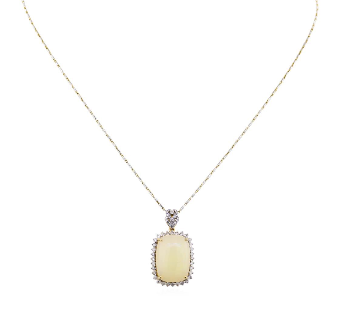 One electronically tested 14KT yellow gold cast & assembled opal & diamond pendant with chain. The 14KT yellow gold pendant features an opal set within a diamond bezel, completed with a diamond set bail. The pendant is supported by a seventeen inch length 14KT yellow gold designer style chain with rhodium accents. Trademark is Orianne. Identified with markings of "14K". Condition is new, good workmanship. Containing: Fifty-Four prong set round brilliant cut diamonds, measuring 1.90 - 1.20 x 0.93mm (depth est.) approximate. Total Weight of 54 Stones = 1.03ct. Graded in the setting. Clarity: SI-2 to I-2. Color: G - H One crystal opal that is cut in a cushion shaped cabochon and is prong set, measuring 20.00 mm long x 14.00 mm wide, and 9.60 mm thick and the approximate weight is 15.35 carats. The opal has a somewhat bright, blue-green play of color (fire) in a flashfire pattern; a high dome; a good cut; no inclusions; slight variation in base in its brightness and pattern; and is slightly directional. Graded in the setting. Total Weight of Diamonds 1.03ct. Total Weight of Opals 15.35ct. AIG Appraised at $5,050.00.