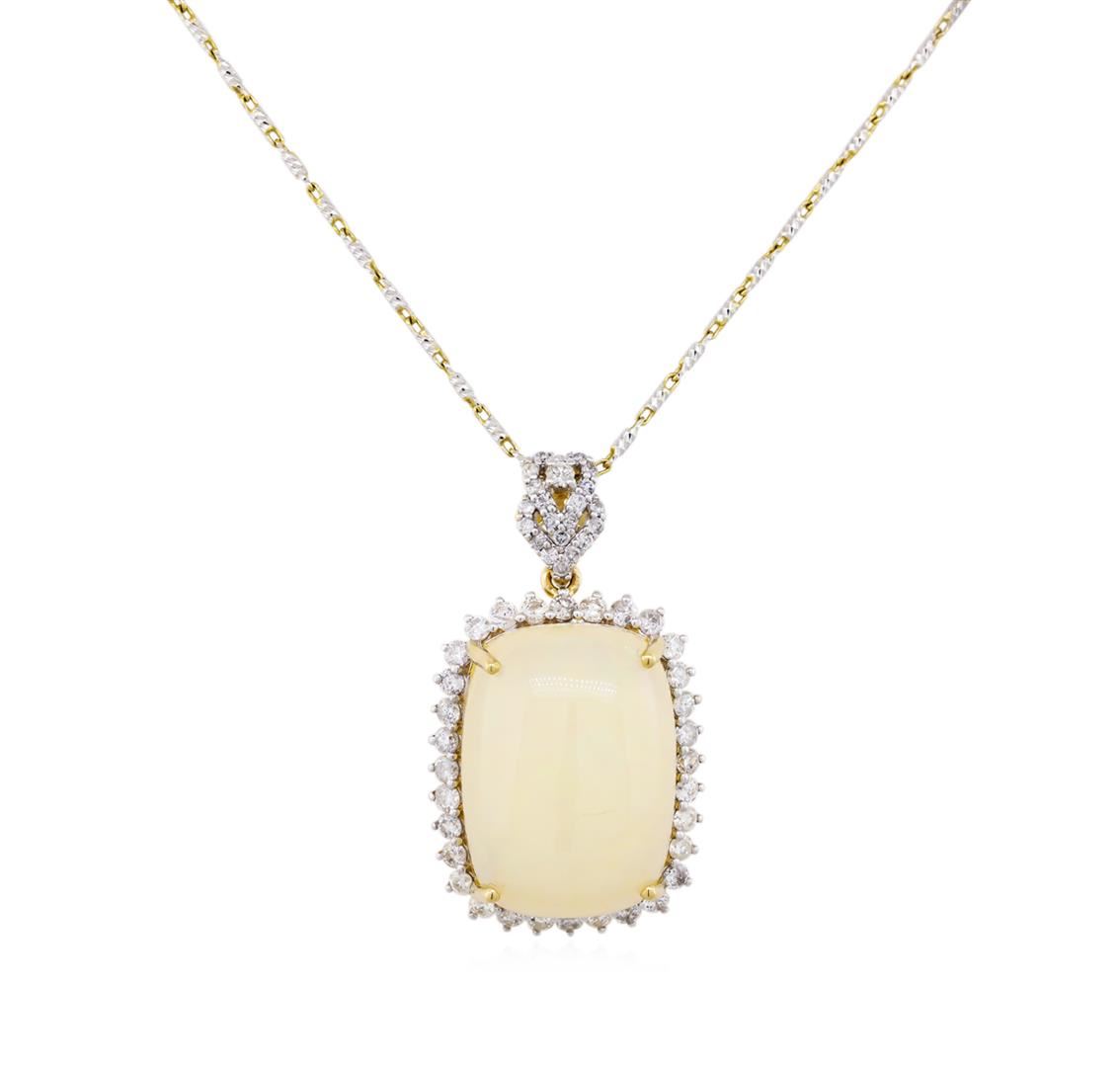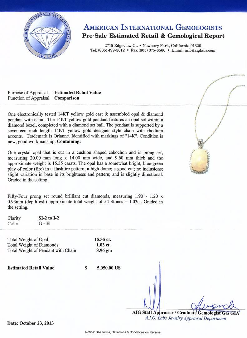 One electronically tested 14KT yellow gold cast & assembled opal & diamond pendant with chain. The 14KT yellow gold pendant features an opal set within a diamond bezel, completed with a diamond set bail. The pendant is supported by a seventeen inch length 14KT yellow gold designer style chain with rhodium accents. Trademark is Orianne. Identified with markings of "14K". Condition is new, good workmanship. Containing: Fifty-Four prong set round brilliant cut diamonds, measuring 1.90 - 1.20 x 0.93mm (depth est.) approximate. Total Weight of 54 Stones = 1.03ct. Graded in the setting. Clarity: SI-2 to I-2. Color: G - H One crystal opal that is cut in a cushion shaped cabochon and is prong set, measuring 20.00 mm long x 14.00 mm wide, and 9.60 mm thick and the approximate weight is 15.35 carats. The opal has a somewhat bright, blue-green play of color (fire) in a flashfire pattern; a high dome; a good cut; no inclusions; slight variation in base in its brightness and pattern; and is slightly directional. Graded in the setting. Total Weight of Diamonds 1.03ct. Total Weight of Opals 15.35ct. AIG Appraised at $5,050.00.