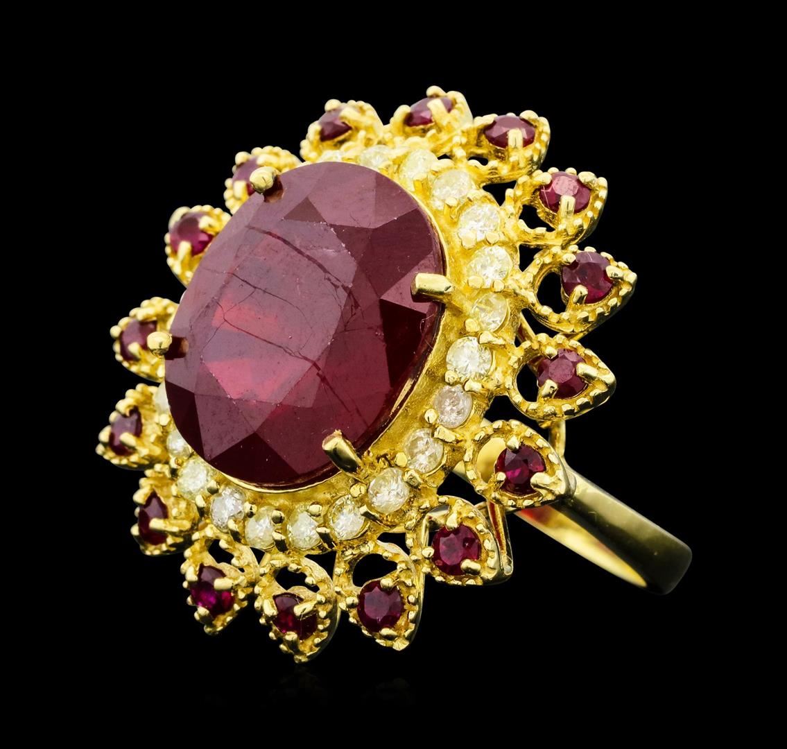 Fourteen karat (14K) yellow gold ruby and diamond ring. An oval cut ruby corundum gemstone is prong mounted in the center of the ring. Round brilliant cut diamonds and ruby corundum gemstones accent the ring around the center gemstone. The ring is cast stamped "14K" and has a gross weight of 11.3 Grams. (1) ruby with a total weight of 14.73cts. (16) rubies with a total weight of 1.05cts. (23) diamonds with a total weight of 0.81cts. GA Appraised.