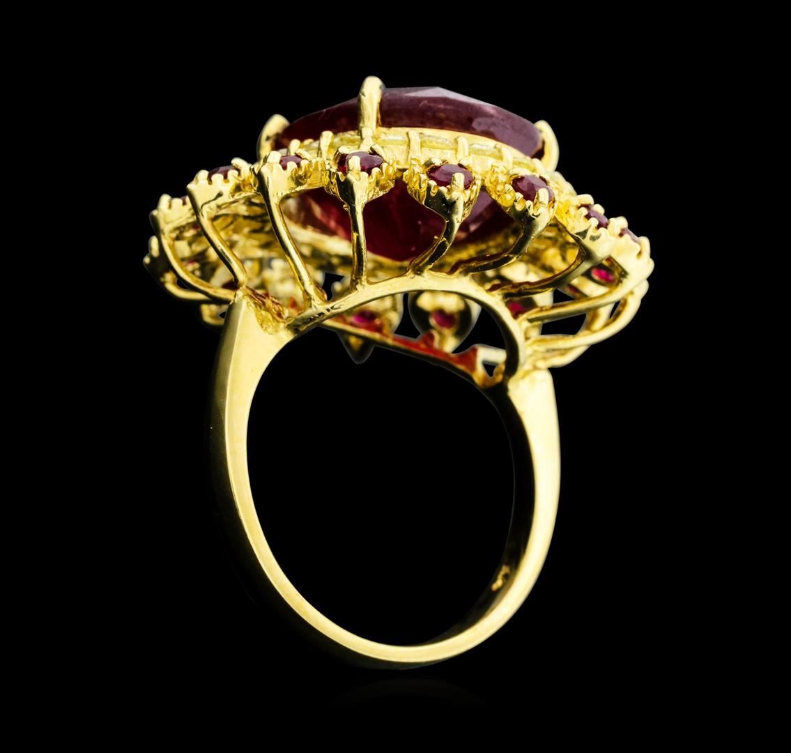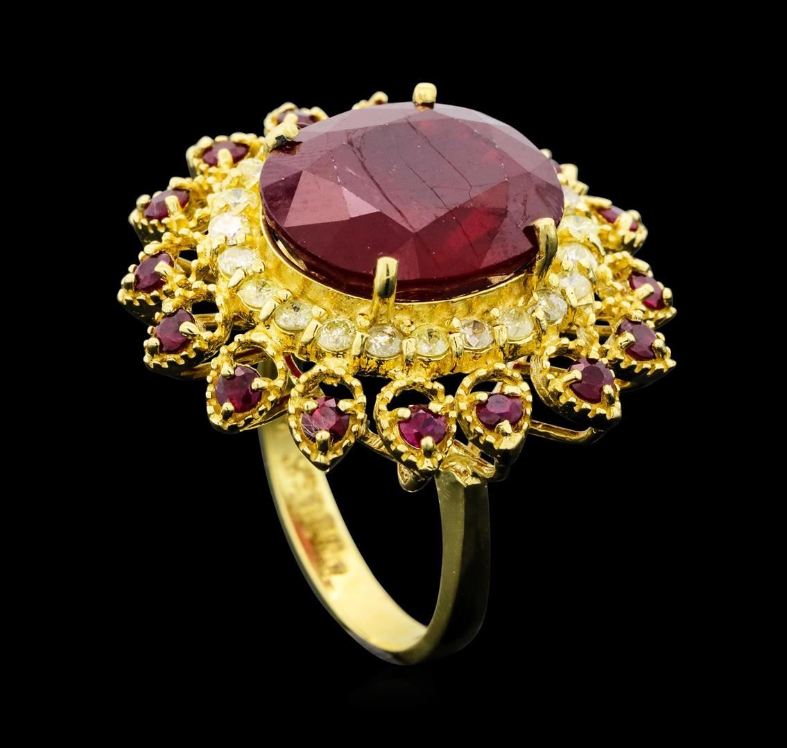 Fourteen karat (14K) yellow gold ruby and diamond ring. An oval cut ruby corundum gemstone is prong mounted in the center of the ring. Round brilliant cut diamonds and ruby corundum gemstones accent the ring around the center gemstone. The ring is cast stamped "14K" and has a gross weight of 11.3 Grams. (1) ruby with a total weight of 14.73cts. (16) rubies with a total weight of 1.05cts. (23) diamonds with a total weight of 0.81cts. GA Appraised.