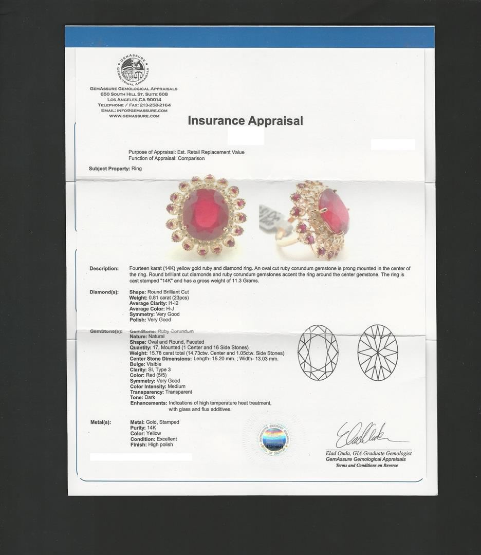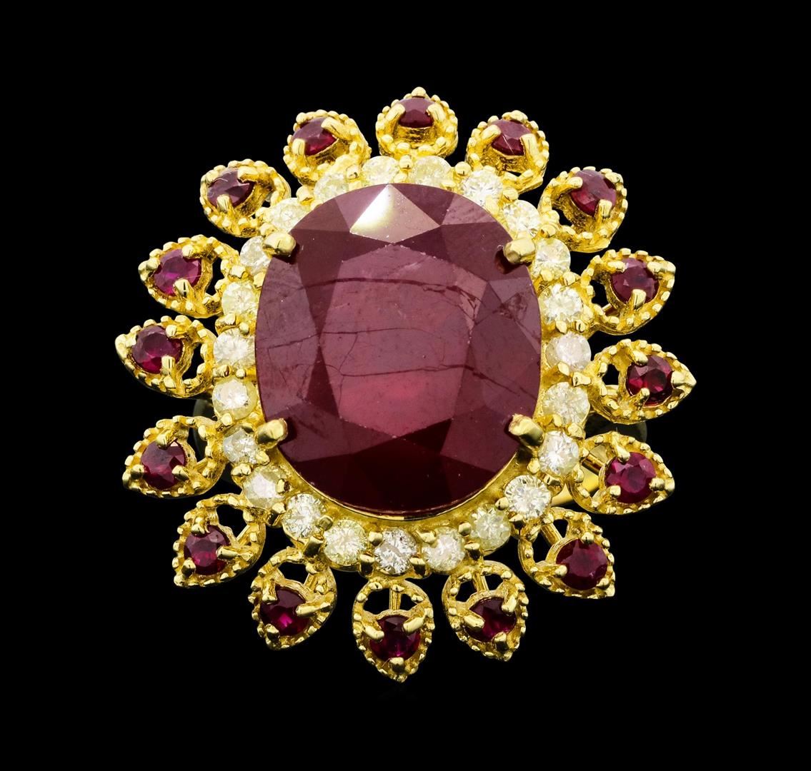 Fourteen karat (14K) yellow gold ruby and diamond ring. An oval cut ruby corundum gemstone is prong mounted in the center of the ring. Round brilliant cut diamonds and ruby corundum gemstones accent the ring around the center gemstone. The ring is cast stamped "14K" and has a gross weight of 11.3 Grams. (1) ruby with a total weight of 14.73cts. (16) rubies with a total weight of 1.05cts. (23) diamonds with a total weight of 0.81cts. GA Appraised.