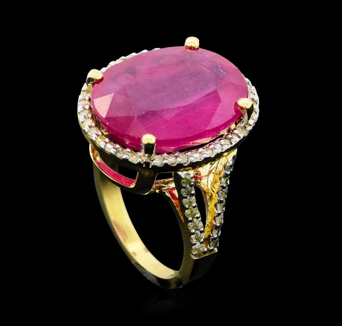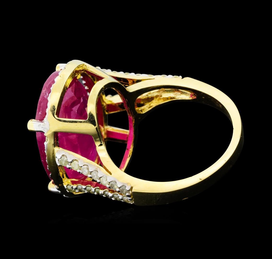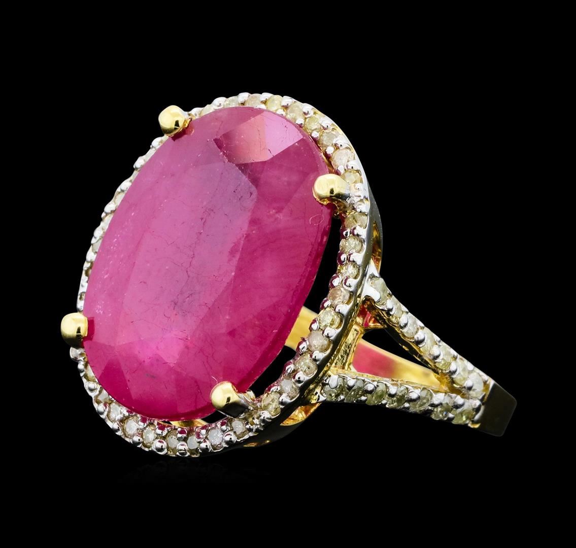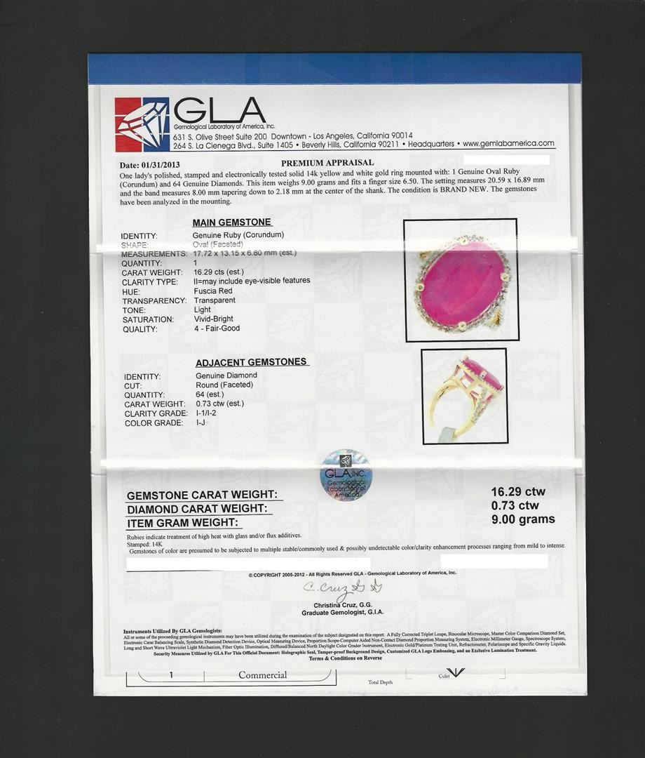 One lady's polished, stamped and electronically tested solid 14k yellow and white gold ring mounted with: 1 Genuine Oval Ruby (Corundum) and 64 Genuine Diamonds. This item weighs 9_00 grams and fits finger 6.50. The setting measures 20.59 x 16.89mm and the band measures 8.00mm tapering down to 2.18mm at the center of the shank. The condition is BRAND NEW. The gemstones have been analyzed in the mounting. Ruby with a total weight of 16.29cts. 64 Diamonds with a total weight of 0.73cts. GLA Appraised.