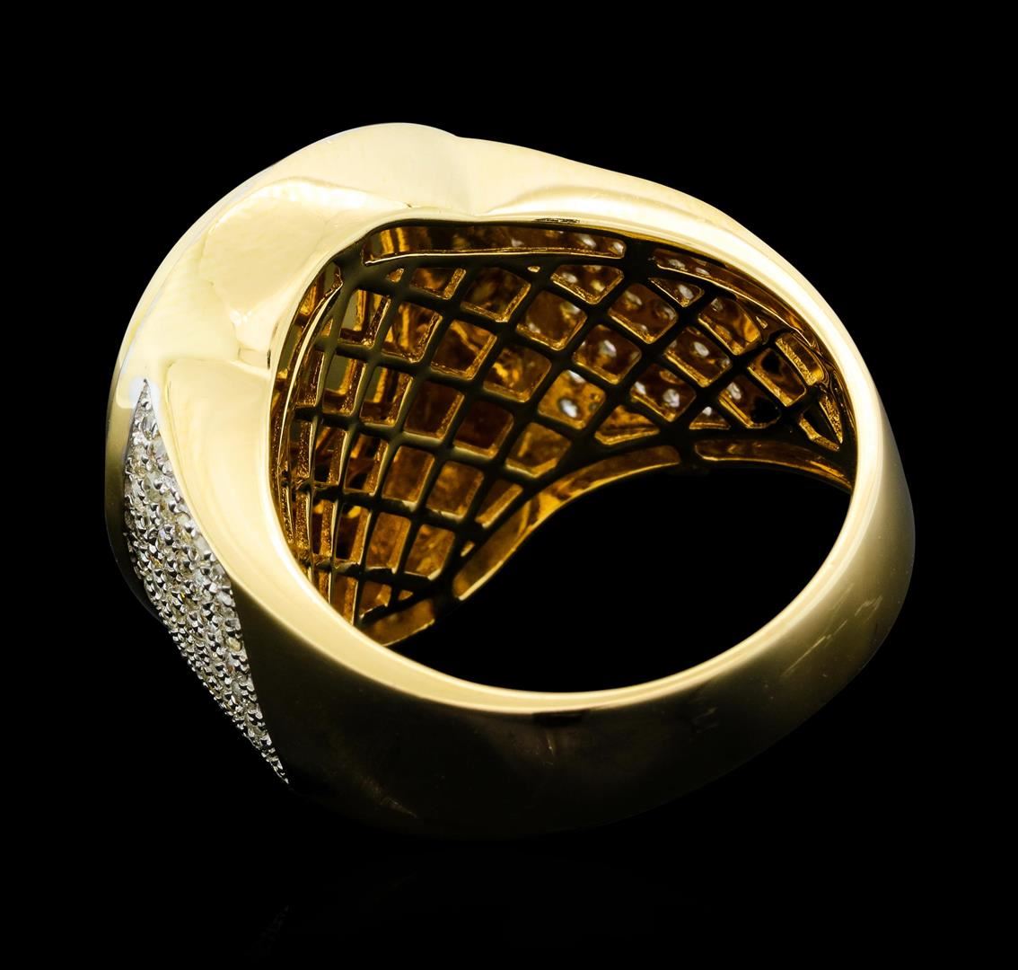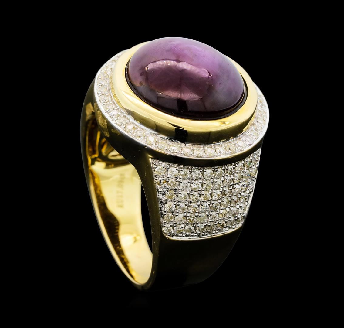 One electronically tested 14KT yellow gold cast star ruby and diamond ring. The featured star ruby is set within a diamond bezel supported by tapering diamond set shoulders, completed by a four and one-half millimeter wide band. Bright polish finish with rhodium accents. Trademark is Orianne. Identified with markings of "14K". Condition is new, good workmanship. Containing: One bezel set round cabochon cut natural star ruby approximate weight of 17.09ct., dark, very slightly brownish, strongly purplish red color, (GIA stpR 7/3), cut is good. This stone has a mostly complete six ray star with medium intensity and good movement. Transmitting light very diffusely, opaque. Naturally occurring internal & externalcharacteristics are present. No indications of heating. Graded in the setting. Rubyhas a low tolerance to rhodium plating, repolishing the surface, & ultrasonic cleaning.One Hundred Forty-Six prong set round brilliant cut diamonds approximate total weight of 146 Stones = 1.09ct. Graded in the setting. Clarity: I-1 to I-3. Color: I - K. Total Weight of Colored Stones 17.09ct. Total Weight of Diamonds 1.09ct. Total Weight of Ring 19.54gm. AIG Appraised.