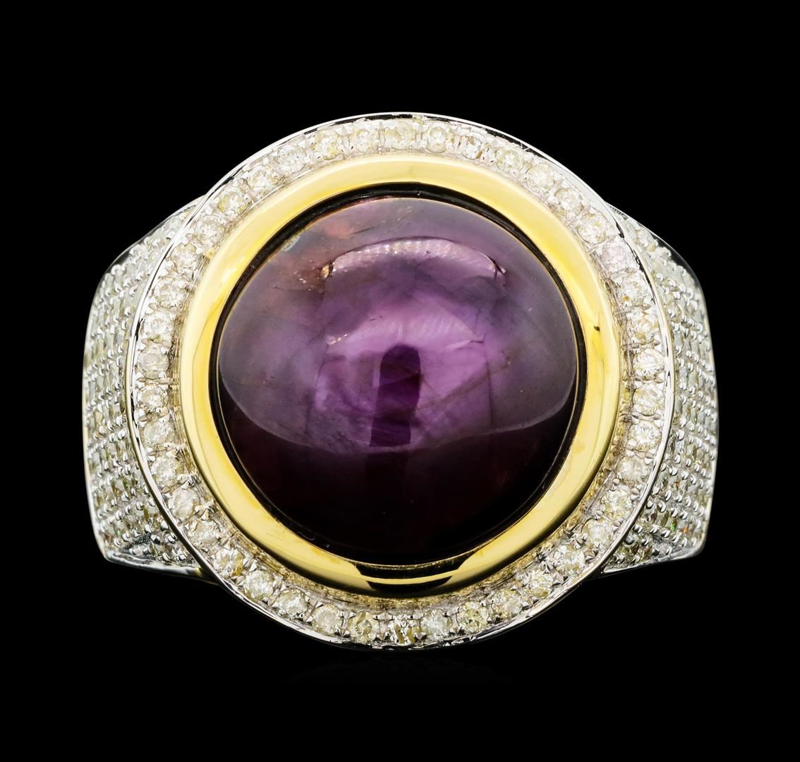 One electronically tested 14KT yellow gold cast star ruby and diamond ring. The featured star ruby is set within a diamond bezel supported by tapering diamond set shoulders, completed by a four and one-half millimeter wide band. Bright polish finish with rhodium accents. Trademark is Orianne. Identified with markings of "14K". Condition is new, good workmanship. Containing: One bezel set round cabochon cut natural star ruby approximate weight of 17.09ct., dark, very slightly brownish, strongly purplish red color, (GIA stpR 7/3), cut is good. This stone has a mostly complete six ray star with medium intensity and good movement. Transmitting light very diffusely, opaque. Naturally occurring internal & externalcharacteristics are present. No indications of heating. Graded in the setting. Rubyhas a low tolerance to rhodium plating, repolishing the surface, & ultrasonic cleaning.One Hundred Forty-Six prong set round brilliant cut diamonds approximate total weight of 146 Stones = 1.09ct. Graded in the setting. Clarity: I-1 to I-3. Color: I - K. Total Weight of Colored Stones 17.09ct. Total Weight of Diamonds 1.09ct. Total Weight of Ring 19.54gm. AIG Appraised.