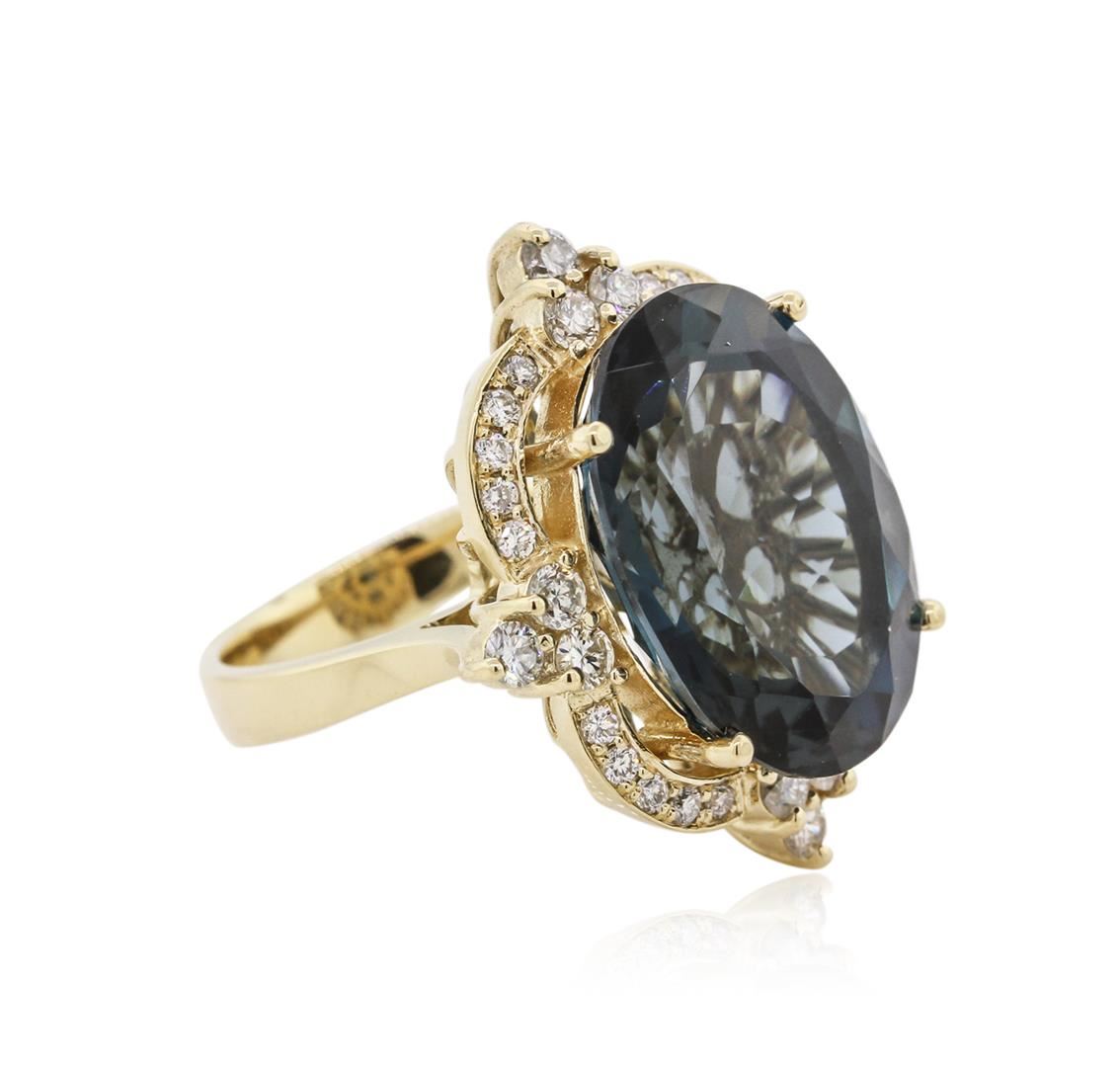 One electronically tested 14KT yellow gold ladies cast topaz and diamond ring with a bright polish finish. Identified with markings of "14K". Condition is new. Containing: One prong set oval modified brilliant cut natural blue topaz, measuring 19.80 x 14.66 x 8.08mm, approximate weight of 17.39ct., clarity is eye clean, type I, medium, moderately strong, very slightly greenish blue color, (GIA vslgB 5/4), cut is good. Thirty-Two prong set round brilliant cut diamonds, measuring 2.50 - 1.30 x 1.14mm (depth est.) approximate total weight of 32 Stones = 0.50ct. Clarity: SI-1 to SI-2. Color: I - J, Cut is Good. Colored gemstones are presumed to have been subjected to commonly used enhancement processes. All diamonds and colored gemstones are graded in the mounting, unless otherwise stated. Total Weight of Colored Stones 17.39ct. Total Weight of Diamonds 0.50ct. Total Weight of Ring 13.70 grams. GGL Appraised at $4,265.00.