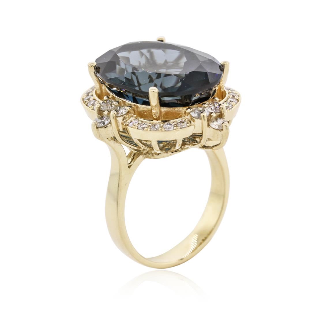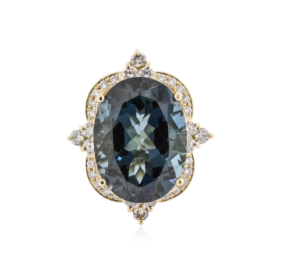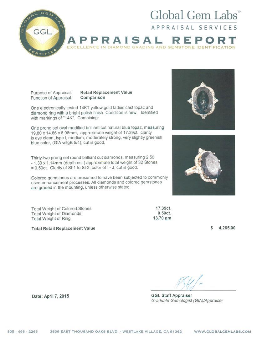 One electronically tested 14KT yellow gold ladies cast topaz and diamond ring with a bright polish finish. Identified with markings of "14K". Condition is new. Containing: One prong set oval modified brilliant cut natural blue topaz, measuring 19.80 x 14.66 x 8.08mm, approximate weight of 17.39ct., clarity is eye clean, type I, medium, moderately strong, very slightly greenish blue color, (GIA vslgB 5/4), cut is good. Thirty-Two prong set round brilliant cut diamonds, measuring 2.50 - 1.30 x 1.14mm (depth est.) approximate total weight of 32 Stones = 0.50ct. Clarity: SI-1 to SI-2. Color: I - J, Cut is Good. Colored gemstones are presumed to have been subjected to commonly used enhancement processes. All diamonds and colored gemstones are graded in the mounting, unless otherwise stated. Total Weight of Colored Stones 17.39ct. Total Weight of Diamonds 0.50ct. Total Weight of Ring 13.70 grams. GGL Appraised at $4,265.00.