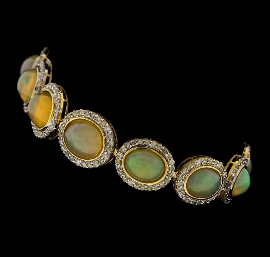 One electronically tested 14KT yellow gold ladies cast & assembled opal and diamond bracelet. Seven and one-quarter inch length bracelet features a slightly graduating flexible opal and diamond bezel ribbon, terminating in a concealed clasp with twin safeties. Bright polish finish with rhodium accents. Trademark is Orianne. Identified with markings of "14K". Condition is new, good workmanship. Containing: Thirteen jelly opals that are cut in a oval shaped cabochon and are bezel set, measuring 9.00 mm long x 7.00 mm wide, and 4.50 mm thick and the approximate weight is 17.95 carats. The opals have a somewhat bright, orange-green play of color (fire) in a flashfire pattern; a high dome; a good cut; no inclusions; slight variation in base in their brightness and pattern; and are somewhat directional. Measurements are an average for the group. Graded in the setting. Three Hundred Twelve prong set round brilliant cut diamonds approximate total weight of 312 Stones = 3.31ct. Graded in the setting. Clarity: I-2 to I-3. Color: I - K. Total Weight of Diamonds 3.31ct. Total Weight of Opals 17.95ct. Total Weight of Bracelet 21.48gm. AIG Appraised at $13,200.00.