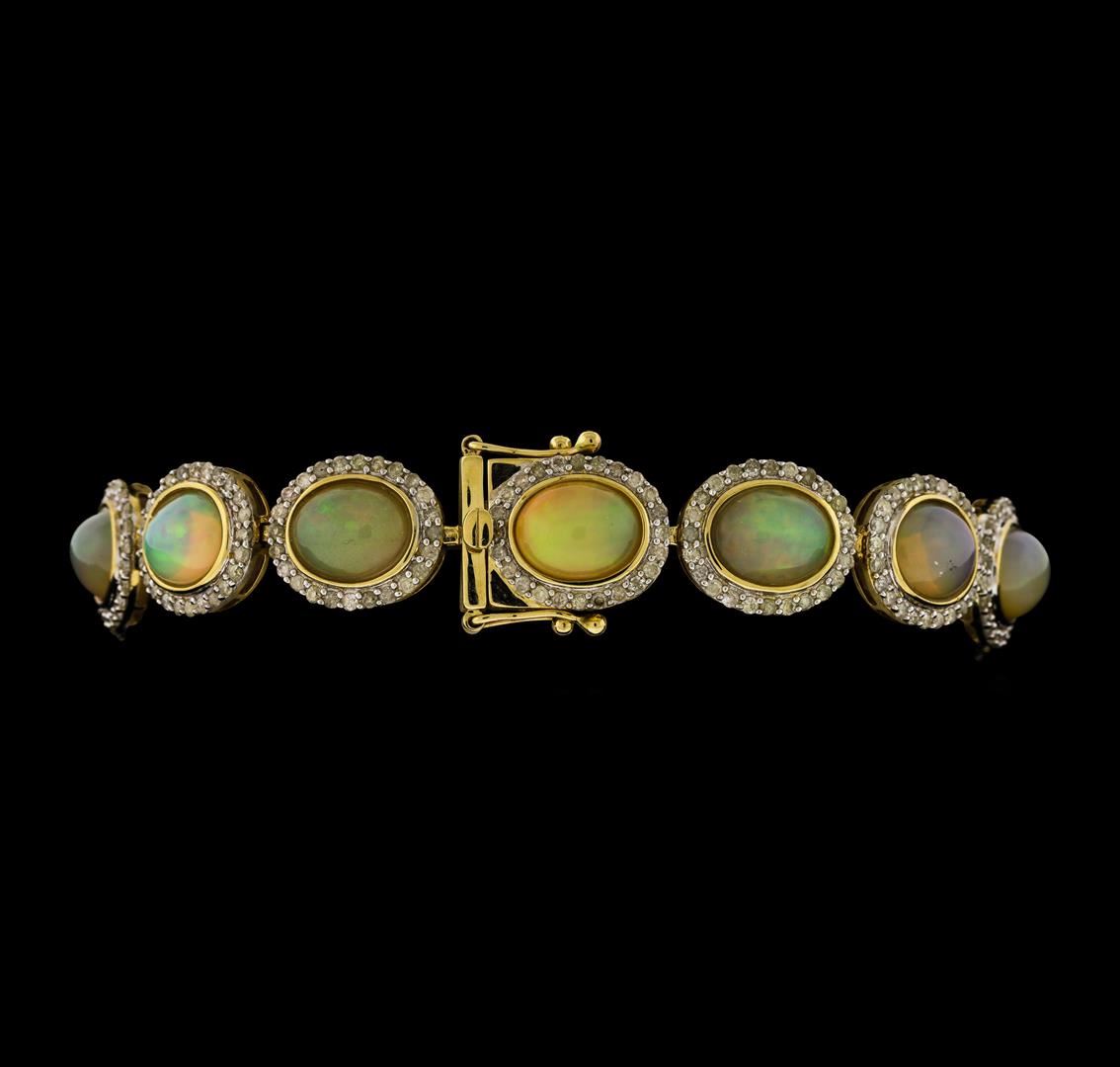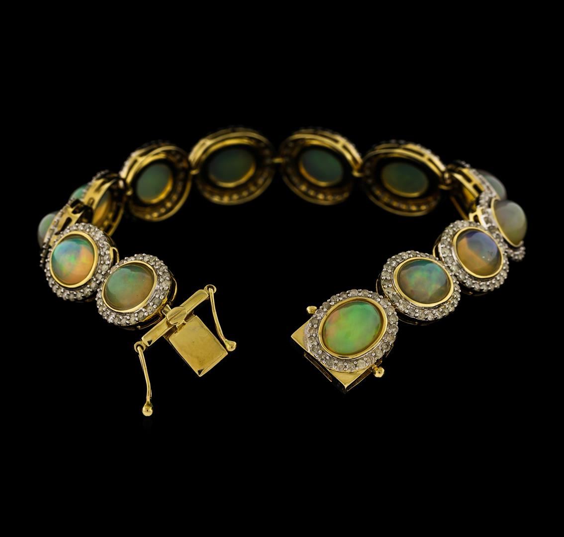 One electronically tested 14KT yellow gold ladies cast & assembled opal and diamond bracelet. Seven and one-quarter inch length bracelet features a slightly graduating flexible opal and diamond bezel ribbon, terminating in a concealed clasp with twin safeties. Bright polish finish with rhodium accents. Trademark is Orianne. Identified with markings of "14K". Condition is new, good workmanship. Containing: Thirteen jelly opals that are cut in a oval shaped cabochon and are bezel set, measuring 9.00 mm long x 7.00 mm wide, and 4.50 mm thick and the approximate weight is 17.95 carats. The opals have a somewhat bright, orange-green play of color (fire) in a flashfire pattern; a high dome; a good cut; no inclusions; slight variation in base in their brightness and pattern; and are somewhat directional. Measurements are an average for the group. Graded in the setting. Three Hundred Twelve prong set round brilliant cut diamonds approximate total weight of 312 Stones = 3.31ct. Graded in the setting. Clarity: I-2 to I-3. Color: I - K. Total Weight of Diamonds 3.31ct. Total Weight of Opals 17.95ct. Total Weight of Bracelet 21.48gm. AIG Appraised at $13,200.00.