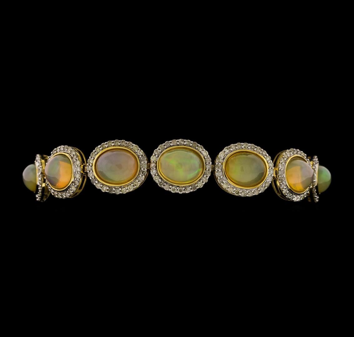 One electronically tested 14KT yellow gold ladies cast & assembled opal and diamond bracelet. Seven and one-quarter inch length bracelet features a slightly graduating flexible opal and diamond bezel ribbon, terminating in a concealed clasp with twin safeties. Bright polish finish with rhodium accents. Trademark is Orianne. Identified with markings of "14K". Condition is new, good workmanship. Containing: Thirteen jelly opals that are cut in a oval shaped cabochon and are bezel set, measuring 9.00 mm long x 7.00 mm wide, and 4.50 mm thick and the approximate weight is 17.95 carats. The opals have a somewhat bright, orange-green play of color (fire) in a flashfire pattern; a high dome; a good cut; no inclusions; slight variation in base in their brightness and pattern; and are somewhat directional. Measurements are an average for the group. Graded in the setting. Three Hundred Twelve prong set round brilliant cut diamonds approximate total weight of 312 Stones = 3.31ct. Graded in the setting. Clarity: I-2 to I-3. Color: I - K. Total Weight of Diamonds 3.31ct. Total Weight of Opals 17.95ct. Total Weight of Bracelet 21.48gm. AIG Appraised.