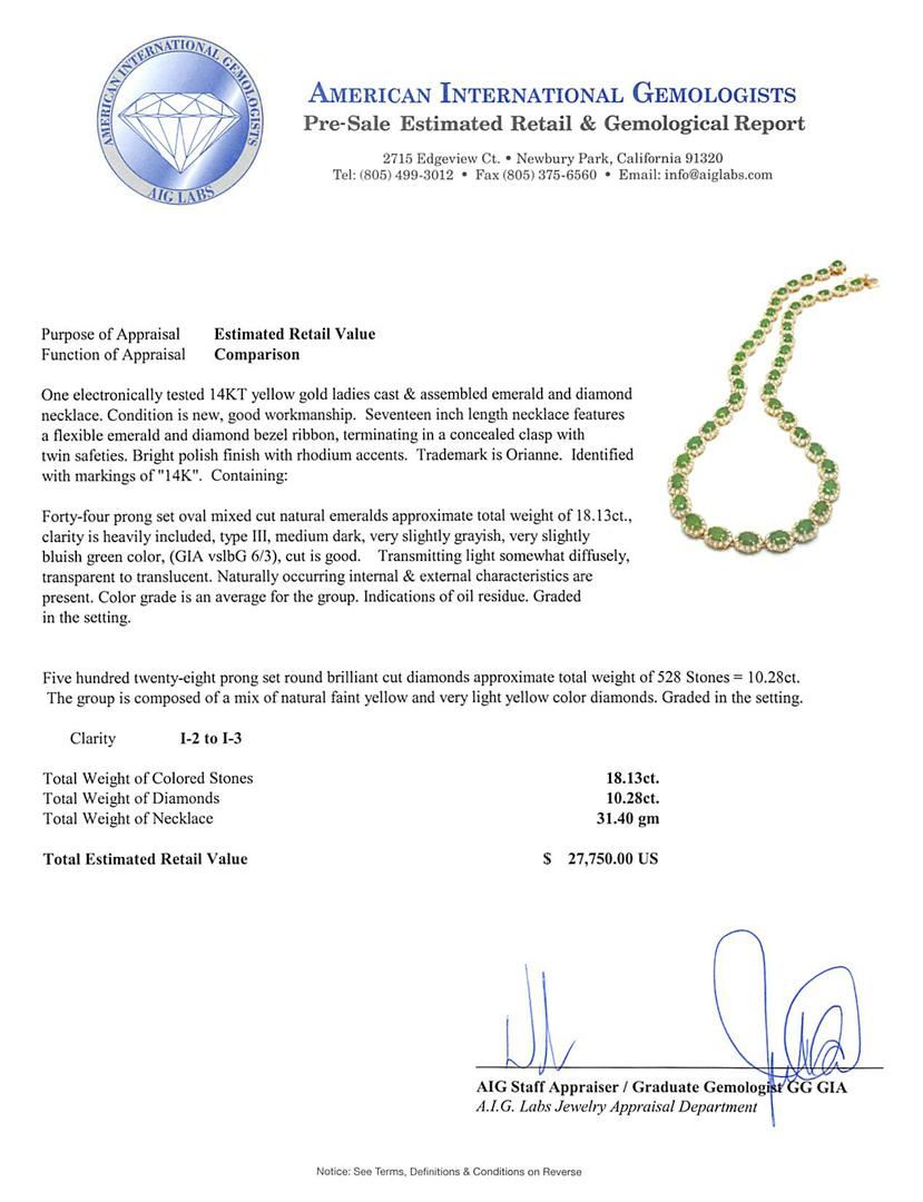 One electronically tested 14KT yellow gold ladies cast & assembled emerald and diamond necklace. Seventeen inch length necklace features a flexible emerald and diamond bezel ribbon, terminating in a concealed clasp with twin safeties. Bright polish finish with rhodium accents. Trademark is Orianne. Identified with markings of "14K". Condition is new, good workmanship. Containing: Forty-four prong set oval mixed cut natural emeralds approximate total weight of 18.13ct., clarity is heavily included, type III, medium dark, very slightly grayish, very slightly bluish green color, (GIA vslbG 6/3), cut is good. Transmitting light somewhat diffusely, transparent to translucent. Naturally occurring internal & external characteristics are present. Color grade is an average for the group. Indications of oil residue. Graded in the setting. Five Hundred Twenty-Eight prong set round brilliant cut diamonds approximate total weight of 528 Stones = 10.28ct. The group is composed of a mix of natural faint yellow and very light yellow color diamonds. Graded in the setting. Clarity: I-2 to I-3. Total Weight of Colored Stones 18.13ct. Total Weight of Diamonds 10.28ct. Total Weight of Necklace 31.40gm. AIG Appraised at $27,750.00.
