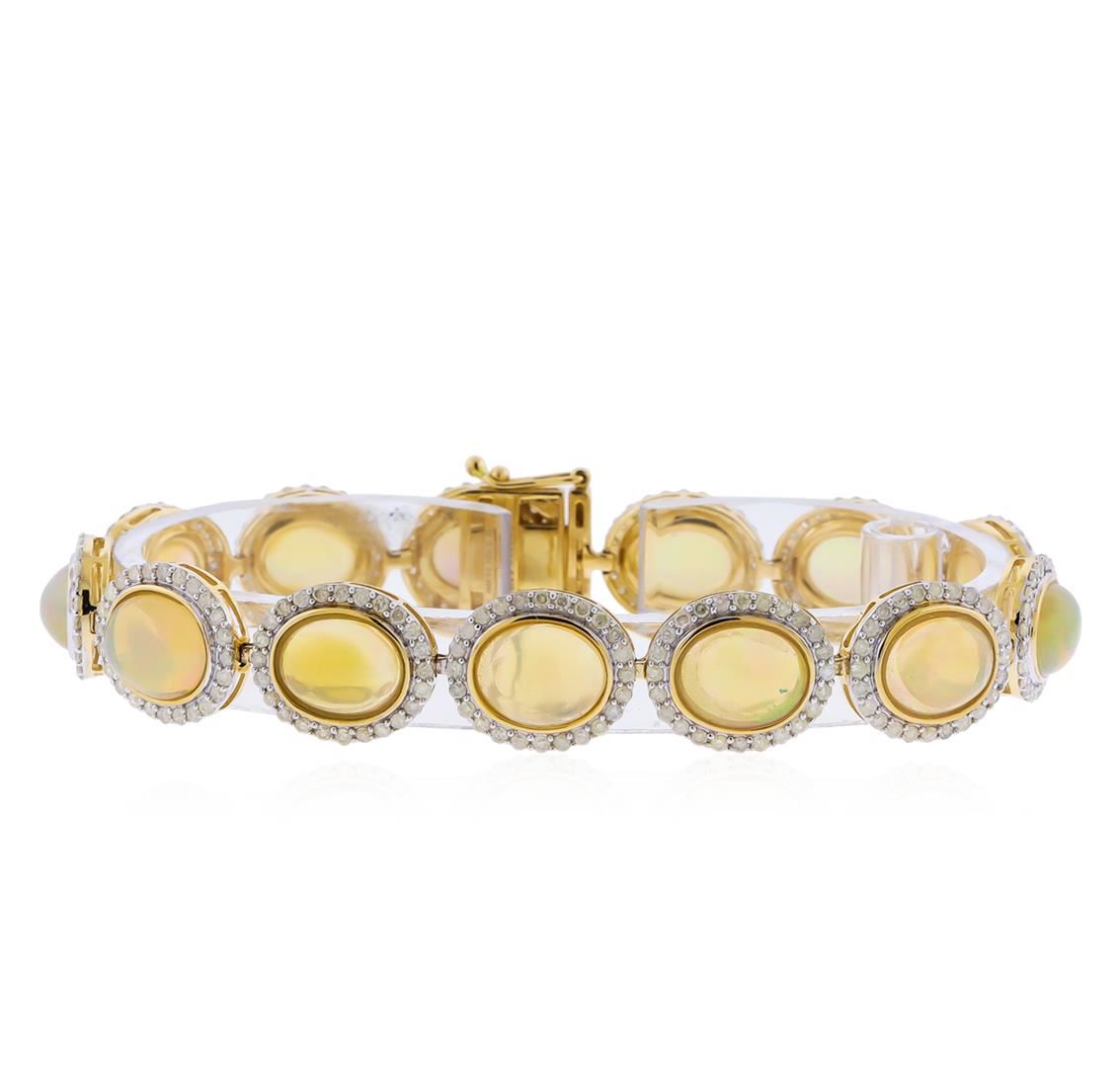 One electronically tested 14KT yellow gold ladies cast & assembled opal and diamond bracelet. Seven and one-quarter inch length bracelet features a slightly graduating flexible opal and diamond bezel ribbon, terminating in a concealed clasp with twin safeties. Bright polish finish with rhodium accents. Trademark is Orianne. Identified with markings of "14K". Condition is new, good workmanship. Containing: Thirteen jelly opals that are cut in a oval shaped cabochon and are bezel set, measuring 9.00 mm long x 7.00 mm wide, and 4.00 mm thick and the approximate weight is 18.43 carats. The opals have a somewhat bright, orange-green play of color (fire) in a flashfire pattern; a high dome; a good cut; slightly included; slight variation in base in their brightness and pattern; and are slightly directional. Measurements are an average for the group. Graded in the setting. Three Hundred Twelve prong set round brilliant cut diamonds approximate total weight of 312 Stones = 3.25ct. Graded in the setting. Clarity: I-2 to I-3. Color: I - K. Total Weight of Diamonds 3.25ct. Total Weight of Opals 18.43ct. Total Weight of Bracelet 21.33gm. AIG Appraised at $13,900.00.