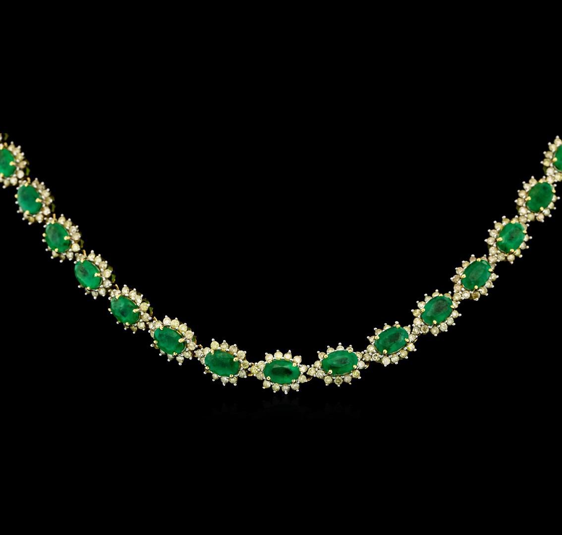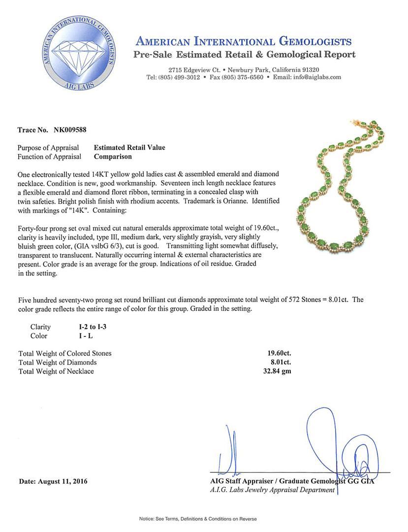 One electronically tested 14KT yellow gold ladies cast & assembled emerald and diamond necklace. Seventeen inch length necklace features a flexible emerald and diamond floret ribbon, terminating in a concealed clasp with twin safeties. Bright polish finish with rhodium accents. Trademark is Orianne. Identified with markings of "14K". Condition is new, good workmanship. Containing: Forty-four prong set oval mixed cut natural emeralds approximate total weight of 19.60ct., clarity is heavily included, type III, medium dark, very slightly grayish, very slightly bluish green color, (GIA vslbG 6/3), cut is good. Transmitting light somewhat diffusely, transparent to translucent. Naturally occurring internal & external characteristics are present. Color grade is an average for the group. Indications of oil residue. Graded in the setting.Five Hundred Seventy-Two prong set round brilliant cut diamonds approximate total weight of 572 Stones = 8.01ct. The color grade reflects the entire range of color for this group. Graded in the setting. Clarity: I-2 to I-3. Color: I - L. Total Weight of Colored Stones 19.60ct. Total Weight of Diamonds 8.01ct. Total Weight of Necklace 32.84gm. AIG Appraised.