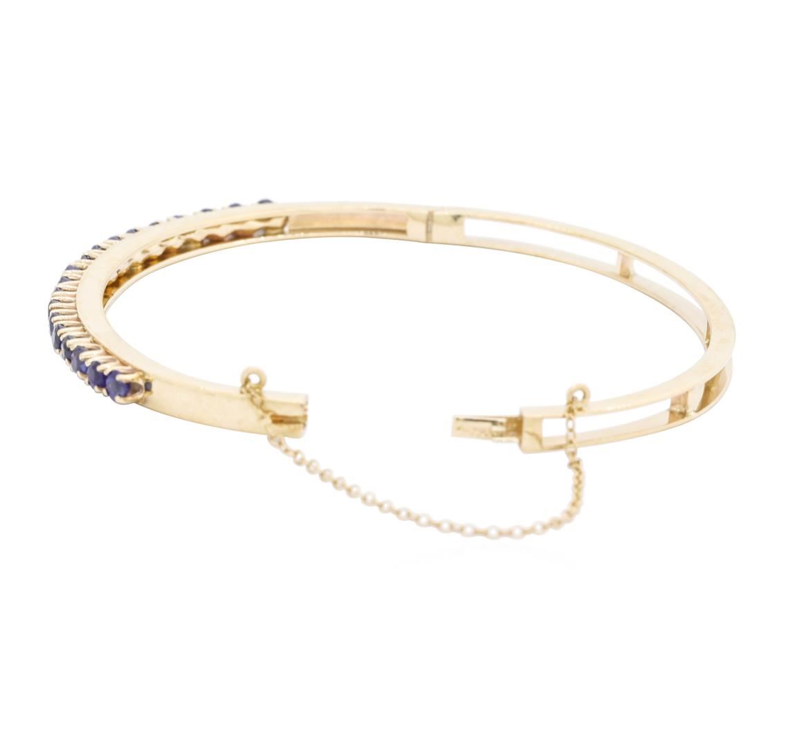 One lady's bangle bracelet featuring: 14KT yellow gold weighing 10.6 grams containing sapphires weighing 2.00ctw. The bracelet has an attached safety chain and measures approximately seven inches in circumference.