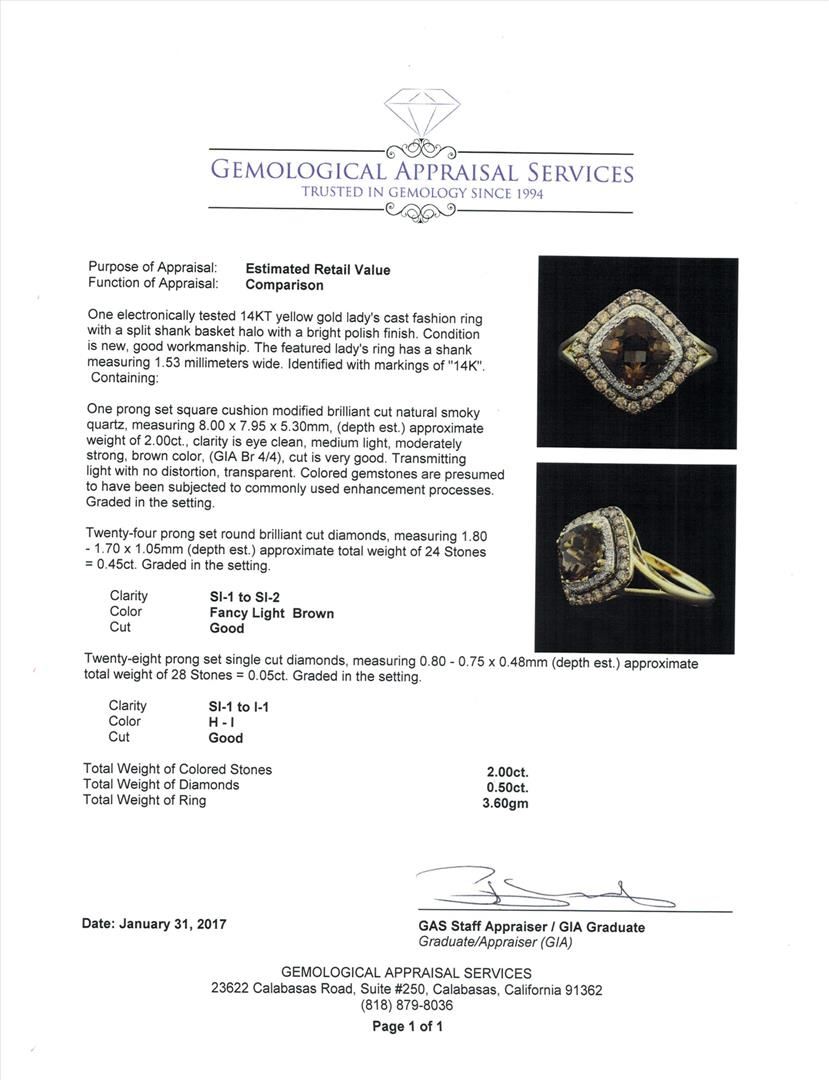 One electronically tested 14KT yellow gold lady's cast fashion ring with a split shank basket halo with a bright polish finish. The featured lady's ring has a shank measuring 1.53 millimeters wide. Identified with markings of "14K". Condition is new, good workmanship. Containing: One prong set square cushion modified brilliant cut natural smoky quartz, measuring 8.00 x 7.95 x 5.30mm, (depth est.) approximate weight of 2.00ct., clarity is eye clean, medium light, moderately strong, brown color, (GIA Br 4/4), cut is very good. Transmitting light with no distortion, transparent. Colored gemstones are presumed to have been subjected to commonly used enhancement processes. Graded in the setting.Twenty-Four prong set round brilliant cut diamonds, measuring 1.80 - 1.70 x 1.05mm (depth est.) approximate total weight of 24 Stones = 0.45ct. Graded in the setting. Clarity: SI-1 to SI-2 Cut Good Twenty-Eight prong set single cut diamonds, measuring 0.80 - 0.75 x 0.48mm (depth est.) approximate total weight of 28 Stones = 0.05ct. Graded in the setting. Clarity: SI-1 to I-1. Color: H - ICut Good. Total Weight of Colored Stones 2.00ct. Total Weight of Diamonds 0.50ct. Total Weight of Ring 3.60gm. GAS Appraised.