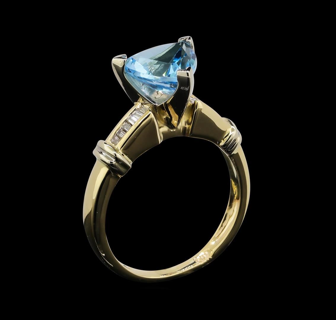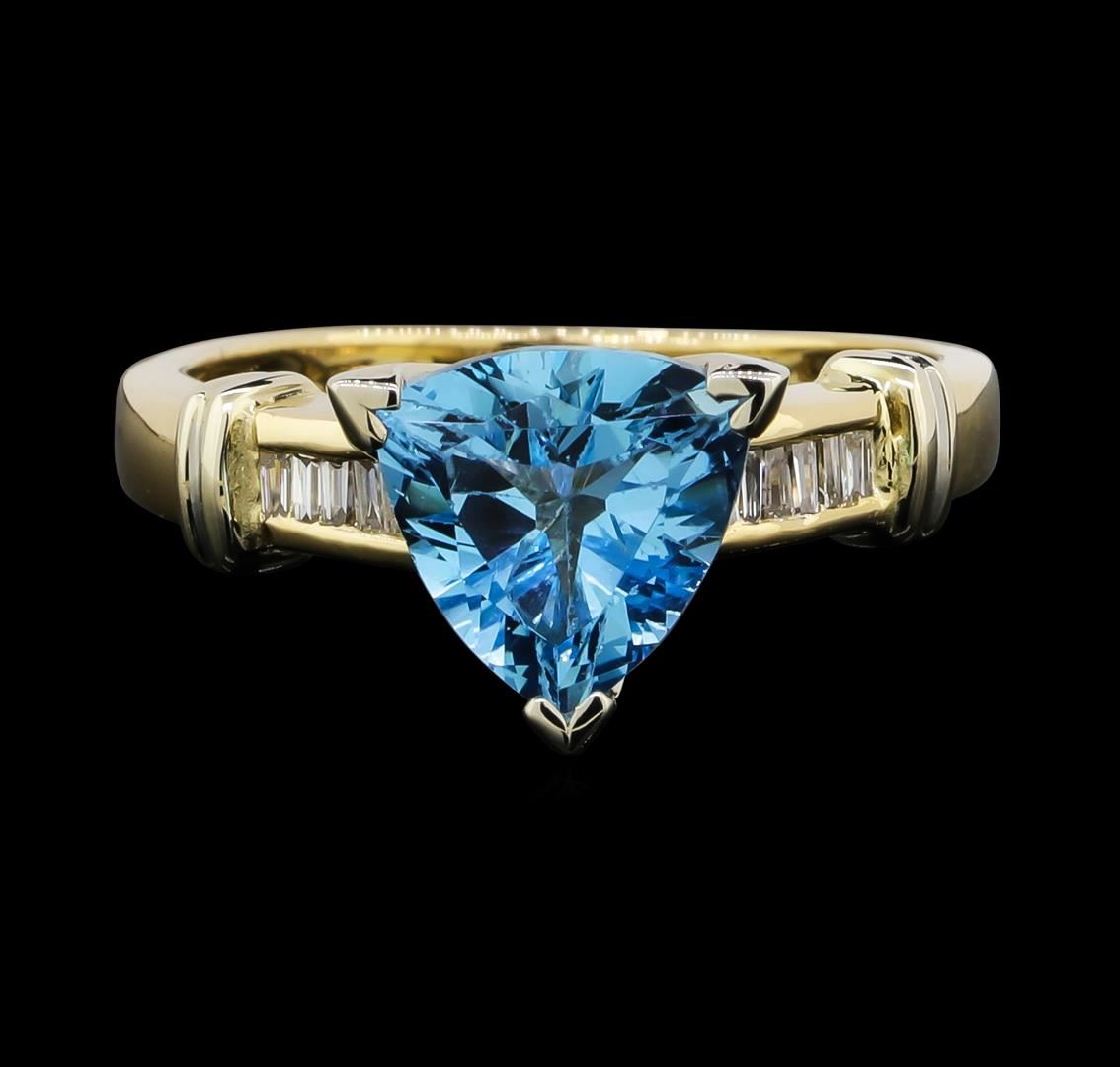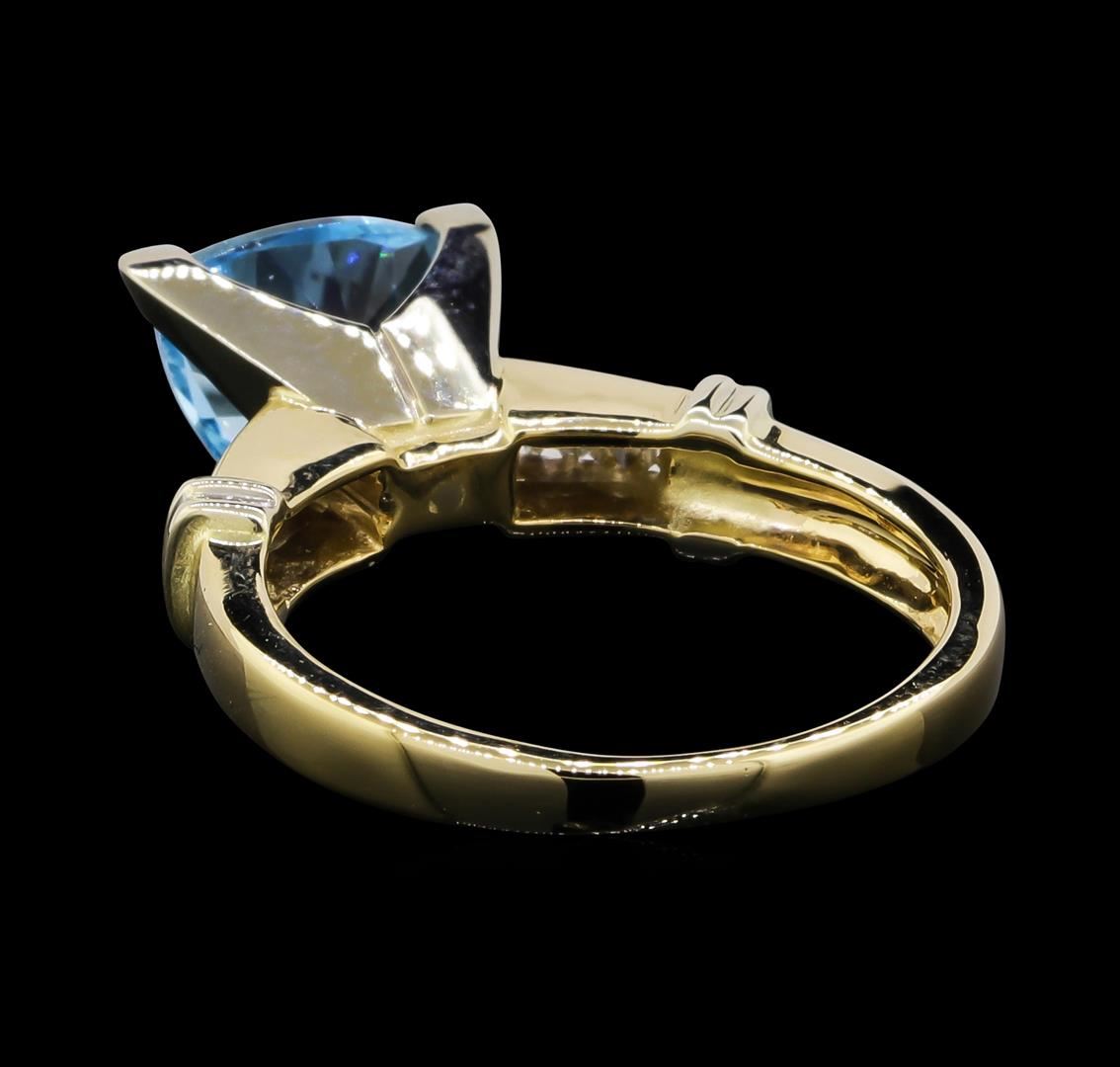 One 14KT Yellow Gold 2.00ct Blue Topaz and Diamond Ring. (1) blue topaz with a total weight of 2.00cts. Diamonds with a total weight of 0.25cts. Total weight of the ring is 4.35 grams.