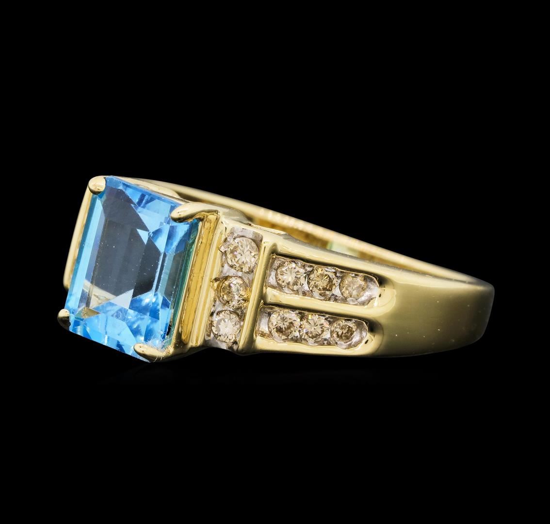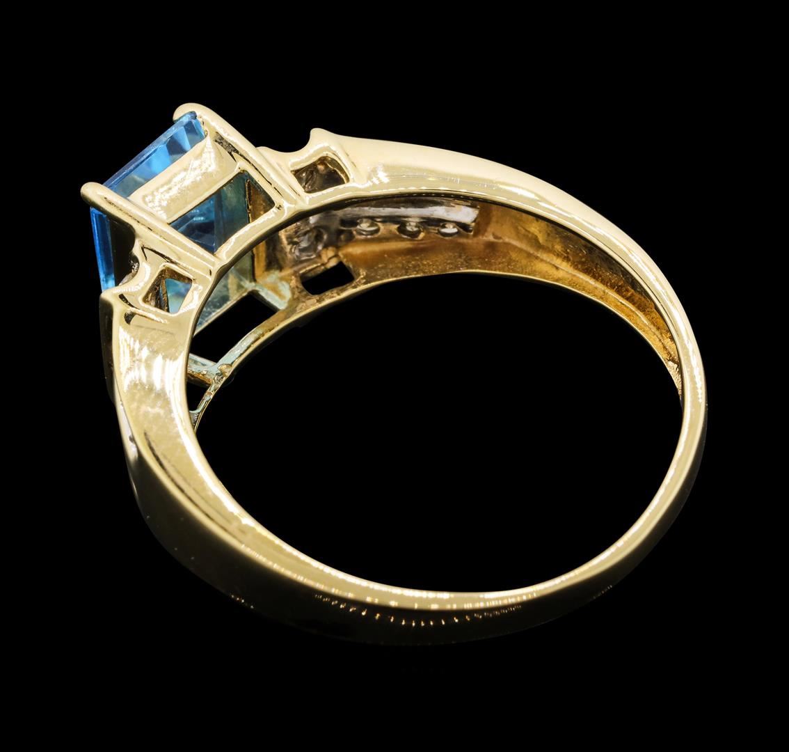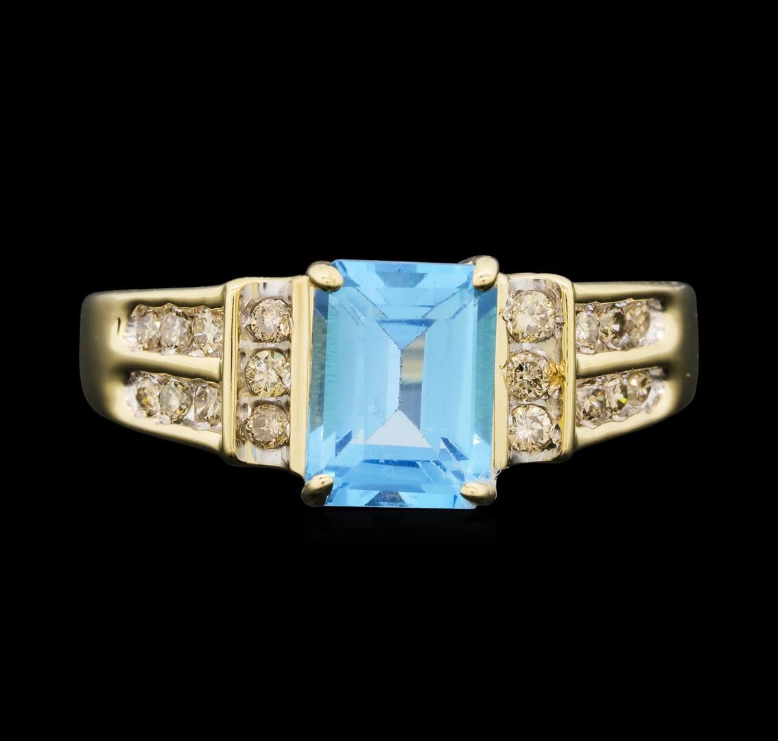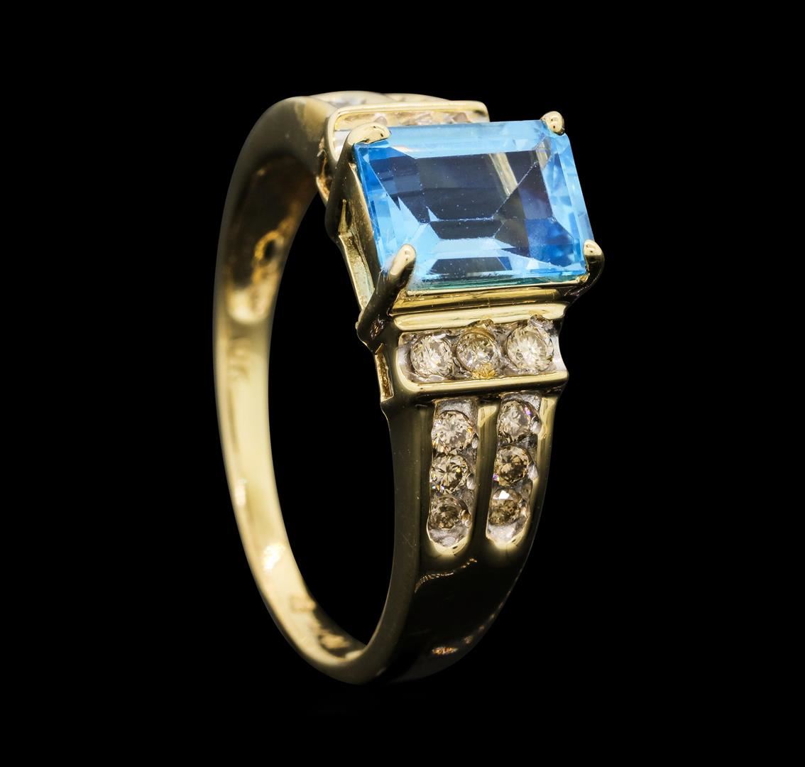 One lady's ring featuring: 14KT yellow gold weighing 2.8 grams containing one center blue topaz weighing 2.00ct and diamonds weighing 0.40ctw. The ring is a size 7.5.