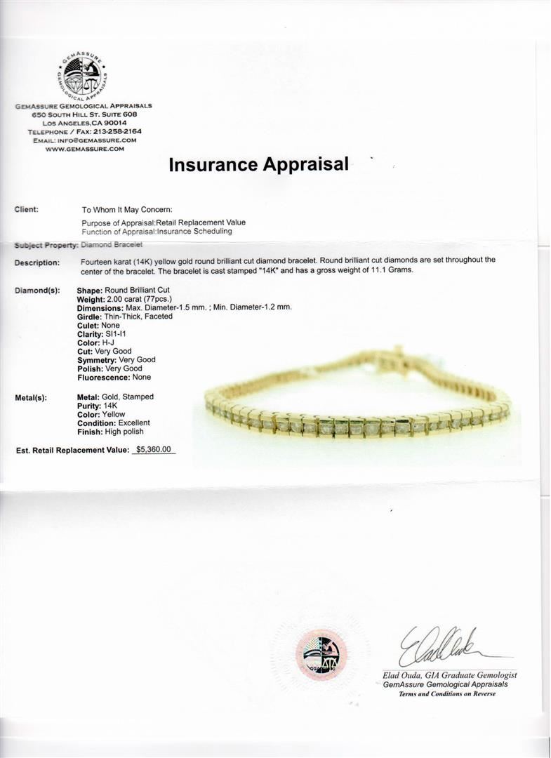 One 14KT Yellow Gold 2.00ctw Diamond Tennis Bracelet with a total weight of 11.1 grams. (77) diamonds with a total weight of 2.00cts with a color of (H-J) and clarity of (SI-1 to I-1). GGA Appraised at $5,360.00.