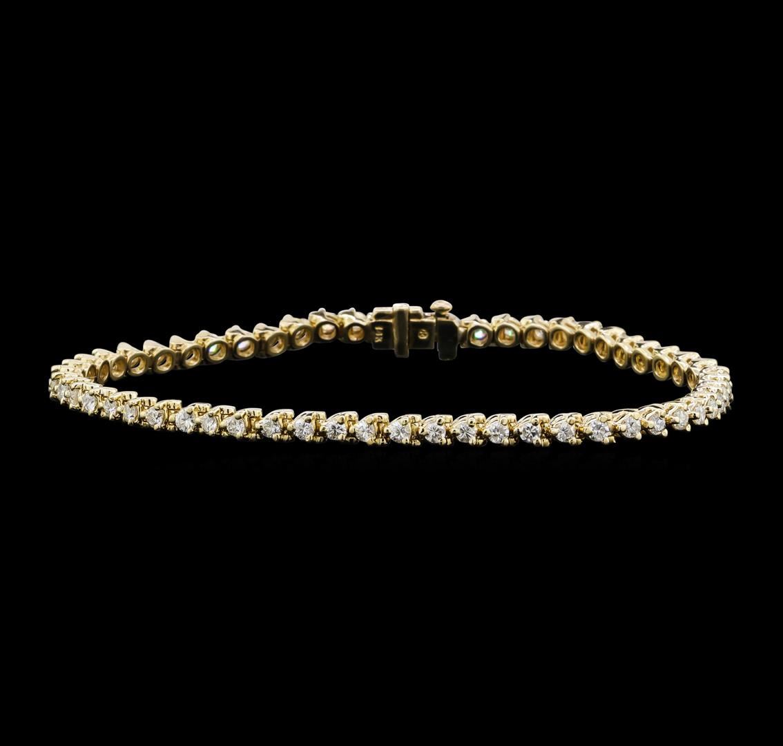 One electronically tested 14KT yellow gold lady's combination cast & assembled tennis bracelet with a tongue clasp & fold over safety with a straight line with a bright polish finish. The featured lady's bracelet measures approximately seven inches in length. Identified with markings of "14K". Condition is like new, good workmanship. Containing: Fifty-Seven prong set round brilliant cut diamonds, measuring 2.10 - 2.05 x 1.29mm (depth est.) approximate total weight of 57 Stones = 2.00ct. Graded in the setting. Clarity: SI-1 to SI-2. Color: H - ICut Good. Total Weight of Diamonds 2.00ct. Total Weight of Bracelet 10.00gm. GAS Appraised at $4,900.00.