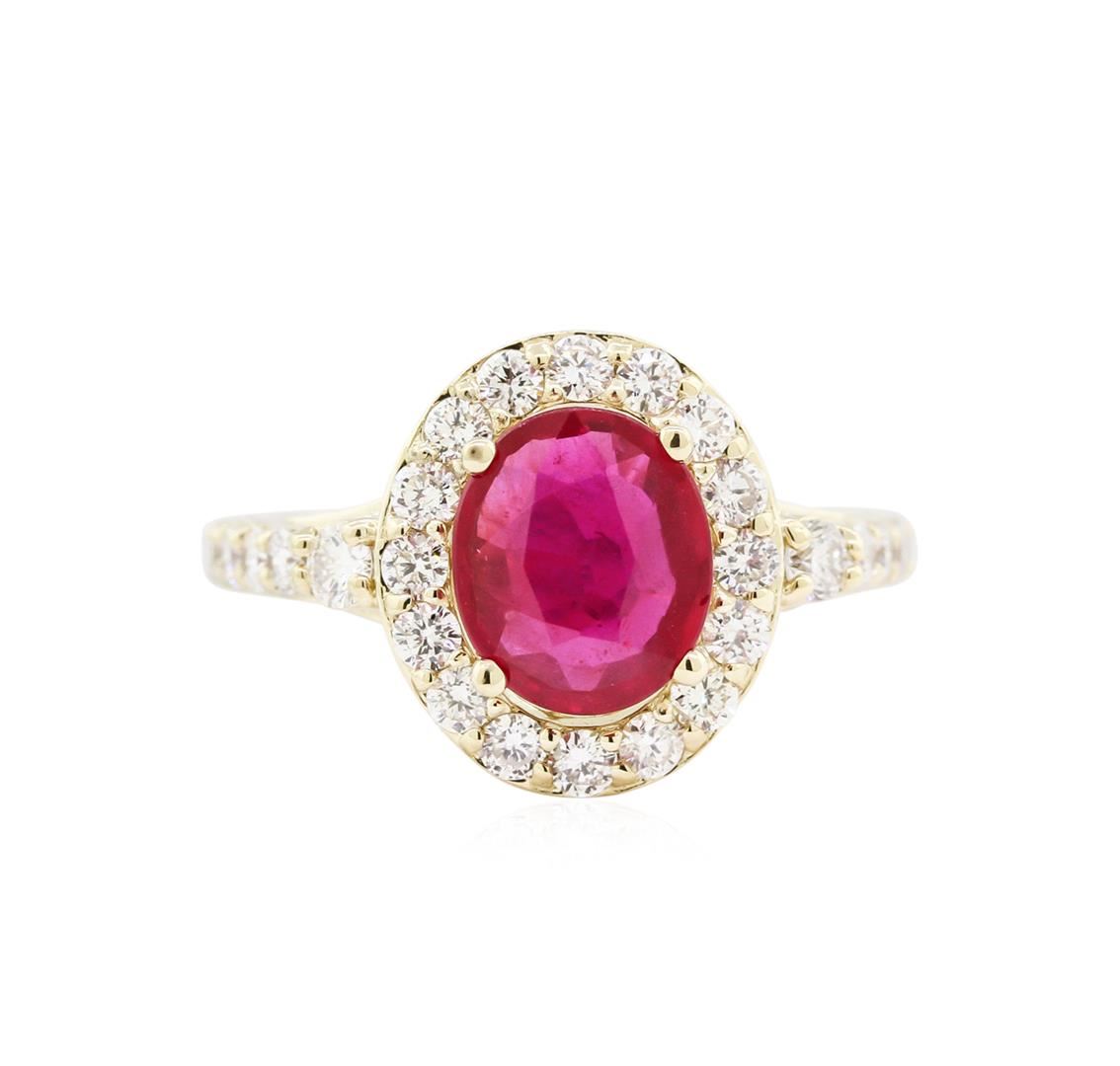One electronically tested 14KT yellow gold ladies cast ruby and diamond ring with a bright polish finish. The featured ruby is set within a diamond bezel supported by an elaborate diamond set under gallery and diamond set shoulders, completed by a two millimeter wide band. Identified with markings of "K14". Condition is new, good workmanship. Containing: One prong set oval mixed cut natural ruby, measuring 8.90 x 7.50 x 2.70mm, 20% bulge factor, exact weight 2.02ct., clarity is heavily included, type II, medium dark, very slightly brownish, red color, (GIA R 6/3), cut is good. Transmitting light somewhat diffusely, transparent to translucent. Naturally occurring internal & external characteristics are present. Indications of laboratory high temperature heat treatment, with glass & flux additives. Graded in the setting. Ruby has a low tolerance to rhodium plating, repolishing the surface, & ultrasonic cleaning. Seventy-Four prong set round brilliant cut diamonds exact total weight 74 Stones = 1.15ct. Graded in the setting. Clarity: SI-1 to SI-2. Color: F - H. Total Weight of Colored Stones 2.02ct. Total Weight of Diamonds 1.15ct. Total Weight of Ring 5.26gm. AIG Appraised at $5,365.00.