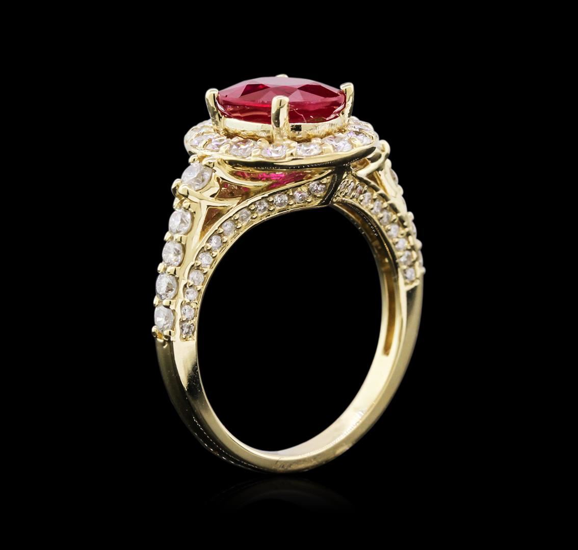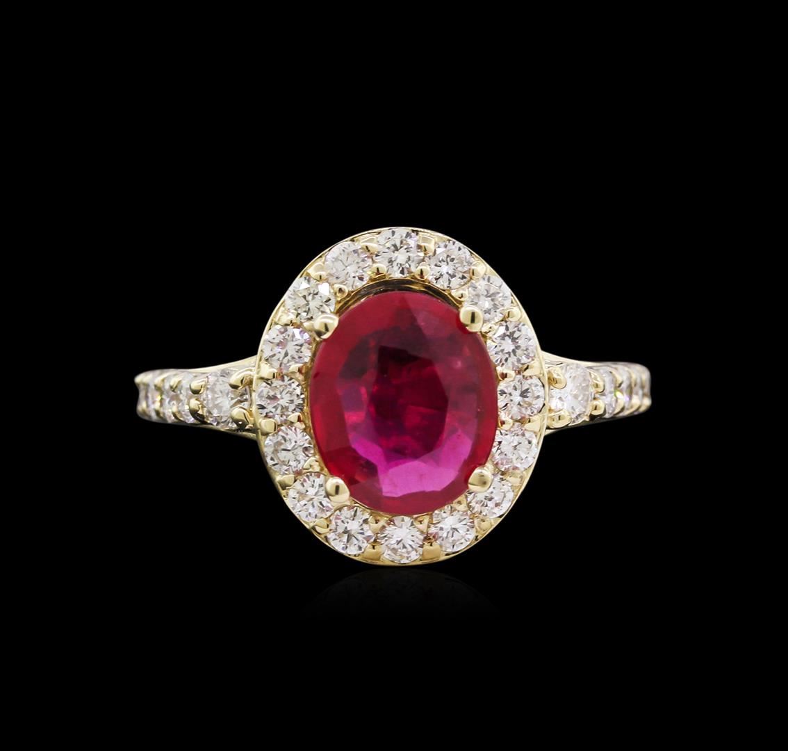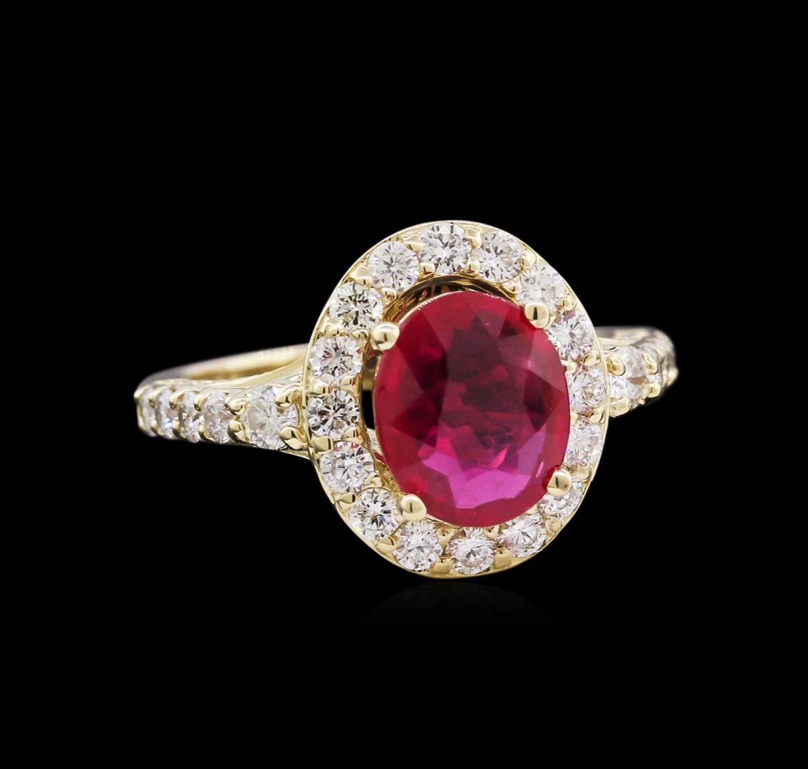 One electronically tested 14KT yellow gold ladies cast ruby and diamond ring with a bright polish finish. The featured ruby is set within a diamond bezel supported by an elaborate diamond set under gallery and diamond set shoulders, completed by a two millimeter wide band. Identified with markings of "K14". Condition is new, good workmanship. Containing: One prong set oval mixed cut natural ruby, measuring 8.90 x 7.50 x 2.70mm, 20% bulge factor, exact weight 2.02ct., clarity is heavily included, type II, medium dark, very slightly brownish, red color, (GIA R 6/3), cut is good. Transmitting light somewhat diffusely, transparent to translucent. Naturally occurring internal & external characteristics are present. Indications of laboratory high temperature heat treatment, with glass & flux additives. Graded in the setting. Ruby has a low tolerance to rhodium plating, repolishing the surface, & ultrasonic cleaning. Seventy-Four prong set round brilliant cut diamonds exact total weight 74 Stones = 1.15ct. Graded in the setting. Clarity: SI-1 to SI-2. Color: F - H. Total Weight of Colored Stones 2.02ct. Total Weight of Diamonds 1.15ct. Total Weight of Ring 5.26gm. AIG Appraised at $5,365.00.