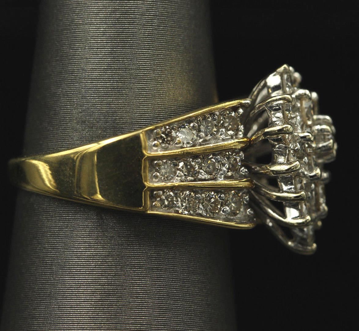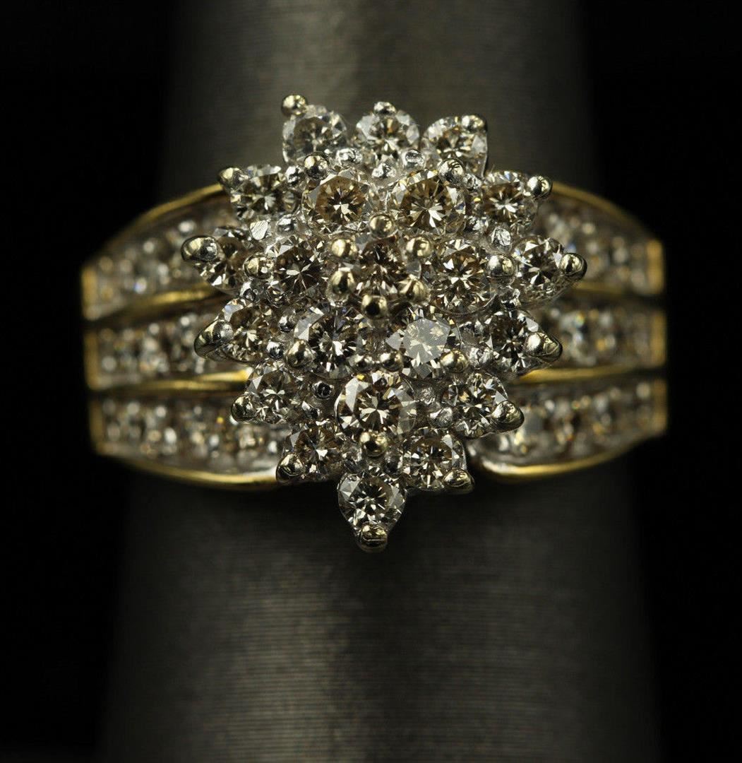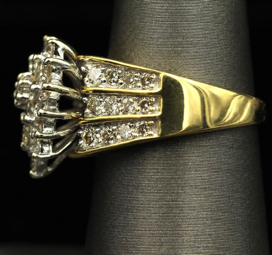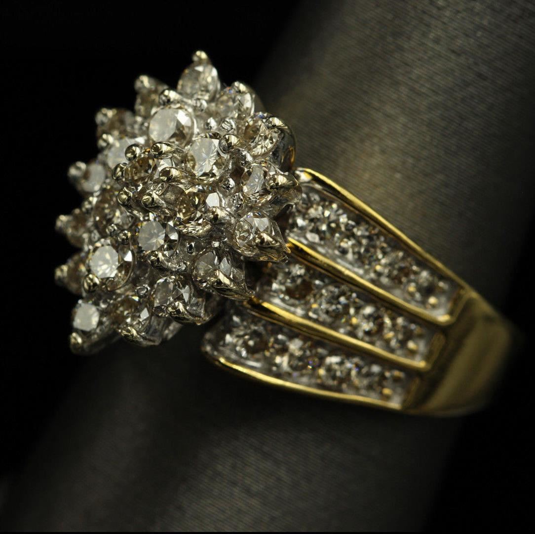 One Woman's Marquise Design Diamond Round Cut in 14k Yellow Gold. Ring size is 6.75 but resizable. The total stone weight is 2.05 carats. Setting style is fashion flower. Gross weight is 7.60 grams with a total of 46 stones. Condition is brand new. Main stone is natural and not enhanced. Main Diamond weight is 2.05 carats, round brilliant cut, SI1 clarity, G-H color, and cut is excellent.