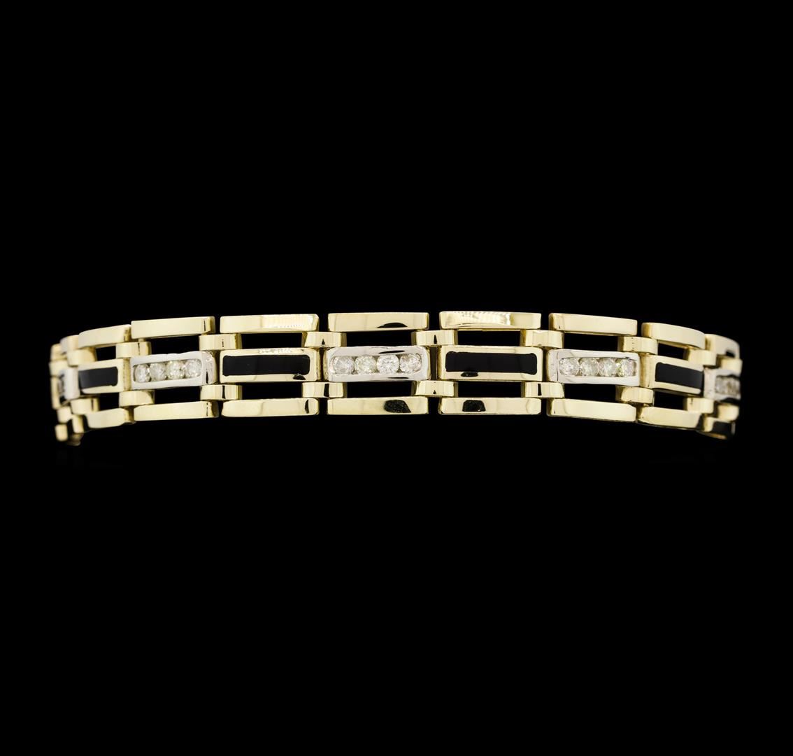 One electronically tested 14KT yellow gold man's combination cast & assembled fashion bracelet with a tongue clasp with foldover safety with a bright polish finish. The featured man's bracelet contains nine pieces of inlaid onyx and measures eight inches in length. Identified with markings of "14K". Condition is like new, good workmanship. Containing: Thirty-Six channel set round brilliant cut diamonds, measuring 2.60 - 2.50 x 1.58mm (depth est.) approximate. Total Weight of 36 Stones = 2.25ct. Graded in the setting. Color I - JClarity SI-2 to I-2 Cut Good. Total Weight of Diamonds 2.25ct.. Total Weight of Bracelet 32.90gm. GAS Appraised.