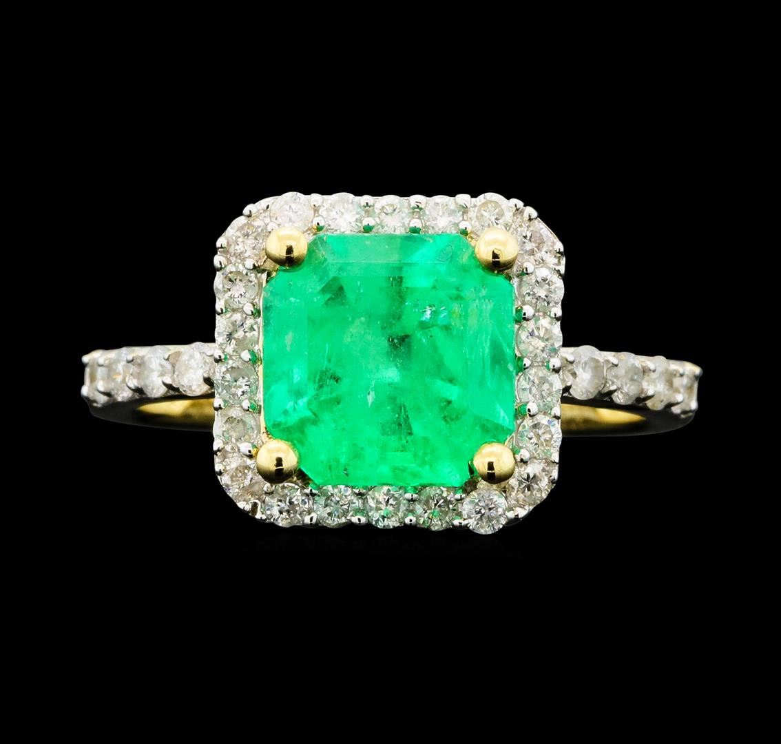 One electronically tested 14KT yellow gold ladies cast emerald and diamond ring. The featured emerald is set within a diamond bezel supported by diamond set shoulders, completed by a two millimeter wide band. Bright polish finish with rhodium accents. Trademark is A. I. Identified with markings of "14K". Condition is new, good workmanship. Containing: One prong set square step cut natural emerald approximate weight of 2.31ct., clarity is moderately included, type III, medium dark, moderately strong, very slightly bluish green color, (GIA vslbG 6/4), cut is good. Transmitting light somewhat diffusely,transparent to translucent. Naturally occurring internal & external characteristics arepresent. Indications of oil residue. Graded in the setting.Thirty-Two prong set round brilliant cut diamonds approximate total weight of 32 Stones = 0.51ct. Graded in the setting. Clarity: I-1 to I-2. Color: G - I. Total Weight of Colored Stones 2.31ct. Total Weight of Diamonds 0.51ct. Total Weight of Ring 3.48gm. AIG Appraised.