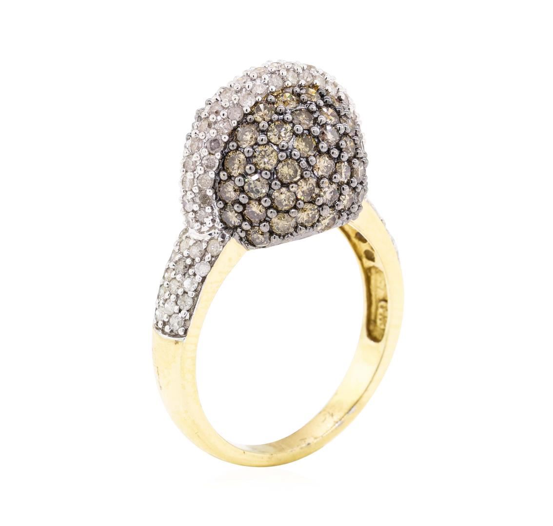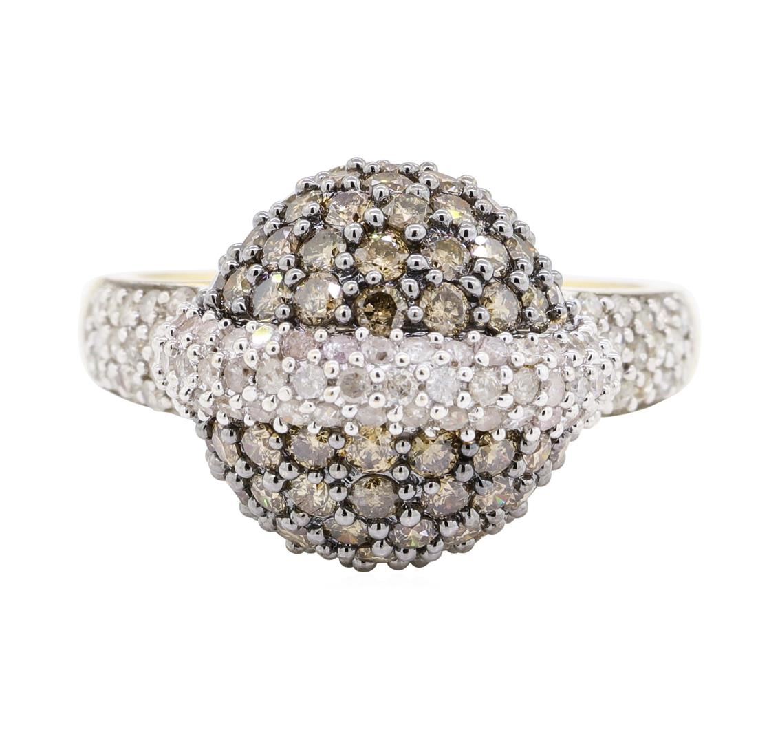 One electronically tested 14KT yellow gold ladies cast fashion sphere raised center ring with a tapered shank with a bright polish finish. The featured ladies ring has a shank measuring 2.62 millimeters wide. Identified with markings of '14K'. Condition is new, good workmanship. Containing: Eighty-Eight prong set round brilliant cut diamonds, measuring 1.30 - 1.20 x 0.78mm (depth est.) approximate total weight of 88 Stones = 0.65ct. Graded in the setting. Color H - K Clarity I-2 to I-3 Cut Good Seventy prong set round brilliant cut treated diamonds, measuring 1.90 - 1.80 x 1.15mm (depth est.) approximate total weight of 70 Stones = 1.68ct. Graded in the setting. Color Fancy Dark Yellowish Brown Clarity SI-1 to SI-3 Cut Good. Total Weight of Diamonds 2.33ct. Total Weight of Ring 7.00gm. GAS Appraised.