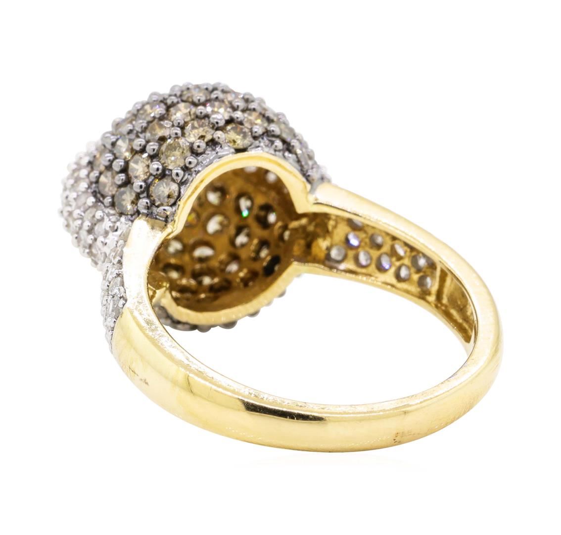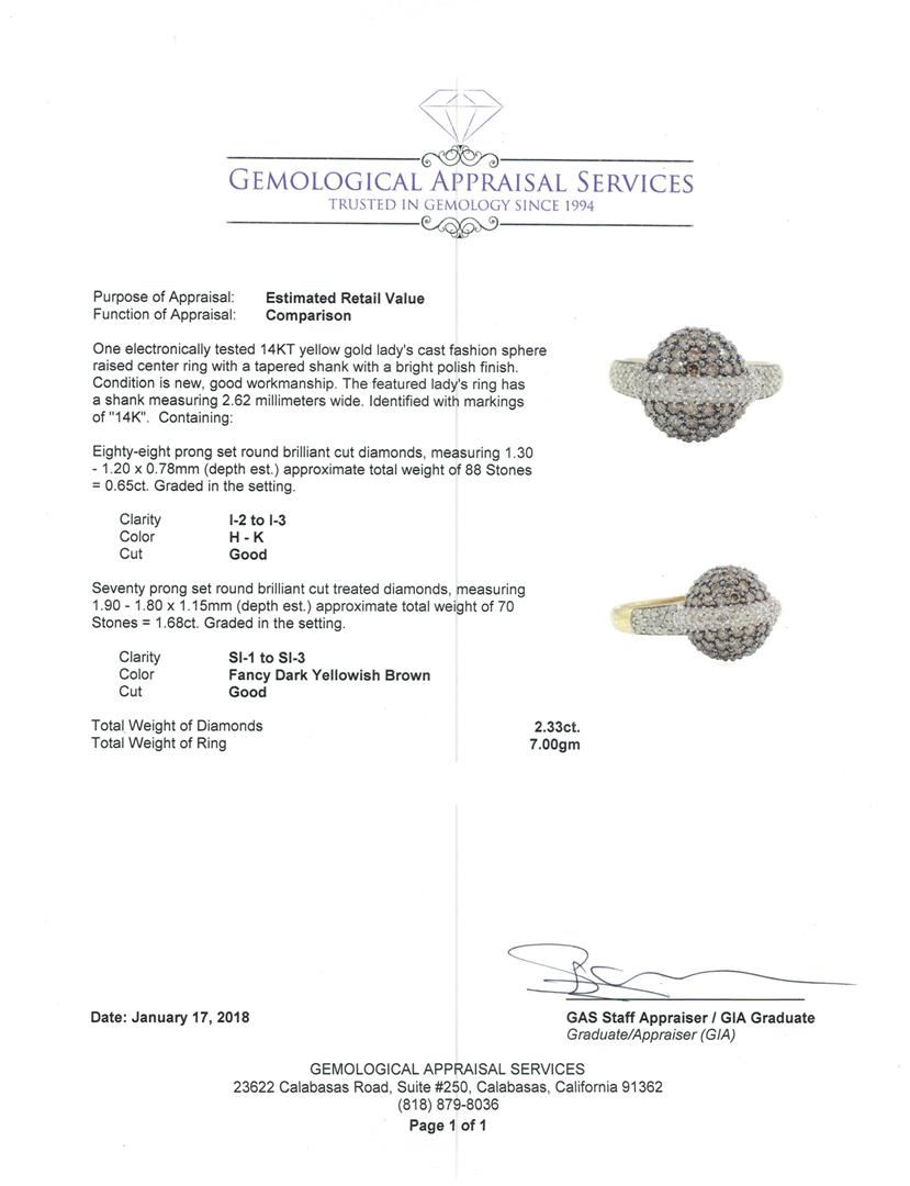 One electronically tested 14KT yellow gold ladies cast fashion sphere raised center ring with a tapered shank with a bright polish finish. The featured ladies ring has a shank measuring 2.62 millimeters wide. Identified with markings of '14K'. Condition is new, good workmanship. Containing: Eighty-Eight prong set round brilliant cut diamonds, measuring 1.30 - 1.20 x 0.78mm (depth est.) approximate total weight of 88 Stones = 0.65ct. Graded in the setting. Color H - K Clarity I-2 to I-3 Cut Good Seventy prong set round brilliant cut treated diamonds, measuring 1.90 - 1.80 x 1.15mm (depth est.) approximate total weight of 70 Stones = 1.68ct. Graded in the setting. Color Fancy Dark Yellowish Brown Clarity SI-1 to SI-3 Cut Good. Total Weight of Diamonds 2.33ct. Total Weight of Ring 7.00gm. GAS Appraised.
