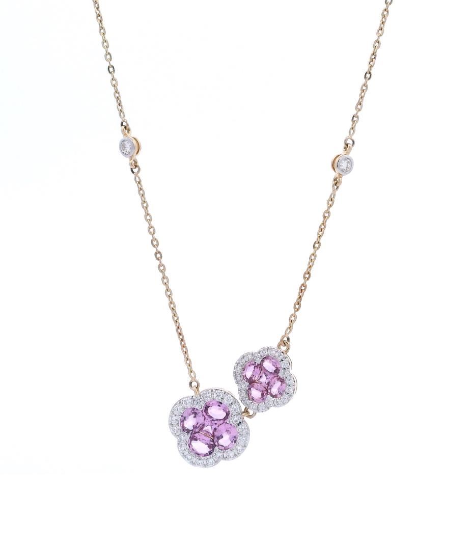 One electronically tested 14KT yellow gold lady's combination cast & assembled double clover necklace with a lobster claw clasp with a basket motif with a bright polish finish. The featured lady's necklace has an adjustable diamond by the yard chain measuring 18 inches in length. Identified with markings of "14K". Condition is new, good workmanship.Containing: Four half bezel set oval modified brilliant cut natural pink sapphires, measuring 4.60 x 3.70 x 2.41mm, (depth est.) approximate total weight of 1.43ct., clarity is eye clean, medium, moderately strong, strongly purplish red color, (GIA stpR 5/4), cut is very good. Transmitting light with a minimum of distortion, transparent. Colored gemstones are presumed to have been subjected to commonly used enhancement processes. Graded in the setting. Four half bezel set oval modified brilliant cut natural pink sapphires, measuring 4.00 x 3.00 x 0.00mm, (depth est.) approximate total weight of 0.50ct., clarity is eye clean, medium, moderately strong, strongly purplish red color, (GIA stpR 5/4), cut is very good. Transmitting light with a minimum of distortion, transparent. Colored gemstones are presumed to have been subjected to commonly used enhancement processes. Graded in the setting. One prong set princess modified brilliant cut natural pink sapphire, measuring 3.50 x 3.50 x 2.28mm, (depth est.) approximate weight of 0.30ct., clarity is eye clean, medium, moderately strong, strongly purplish red color, (GIA stpR 5/4), cut is very good. Transmitting light with a minimum of distortion, transparent. Colored gemstones are presumed to have been subjected to commonly used enhancement processes. Graded in the setting. One prong set princess modified brilliant cut natural pink sapphire, measuring 2.50 x 2.50 x 1.63mm, (depth est.) approximate weight of 0.10ct., clarity is eye clean, medium, moderately strong, strongly purplish red color, (GIA stpR 5/4), cut is very good. Transmitting light with a minimum of distortion, transparent. Colored gemstones are presumed to have been subjected to commonly used enhancement processes. Graded in the setting. Six bezel set round brilliant cut diamonds, measuring 2.80 - 2.70 x 1.65mm (depth est.) approximate total weight of 6 Stones = 0.42ct. Graded in the setting. Color: H - I. Clarity: SI-1 to SI-2. Cut: Very Good. Forty prong set round brilliant cut diamonds, measuring 1.50 - 1.20 x 0.81mm (depth est.) approximate total weight of 40 Stones = 0.37ct. Graded in the setting. Color: H - I. Clarity: SI-1 to SI-2. Cut: Very Good. Total Weight of Colored Stones: 2.33ct. Total Weight of Diamonds: 0.79ct. Total Weight of Necklace: 6.50gm. Appraised by Gemological Appraisal Services. GAS Appraised.