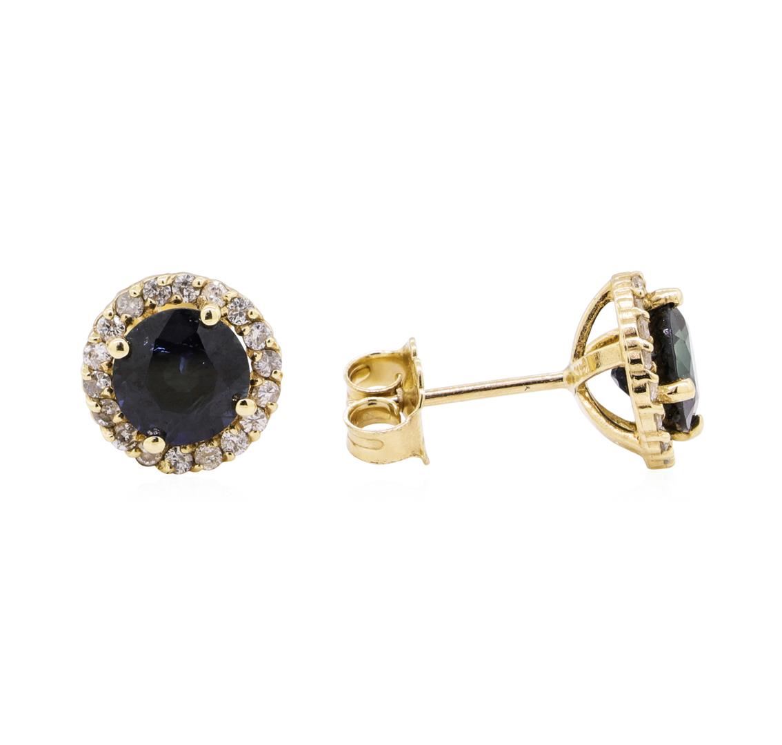 One pair of halo stud earrings featuring: 14KT yellow gold weighing 1.9 grams containing blue sapphires weighing 2.16ctw and diamonds weighing 0.29ctw.