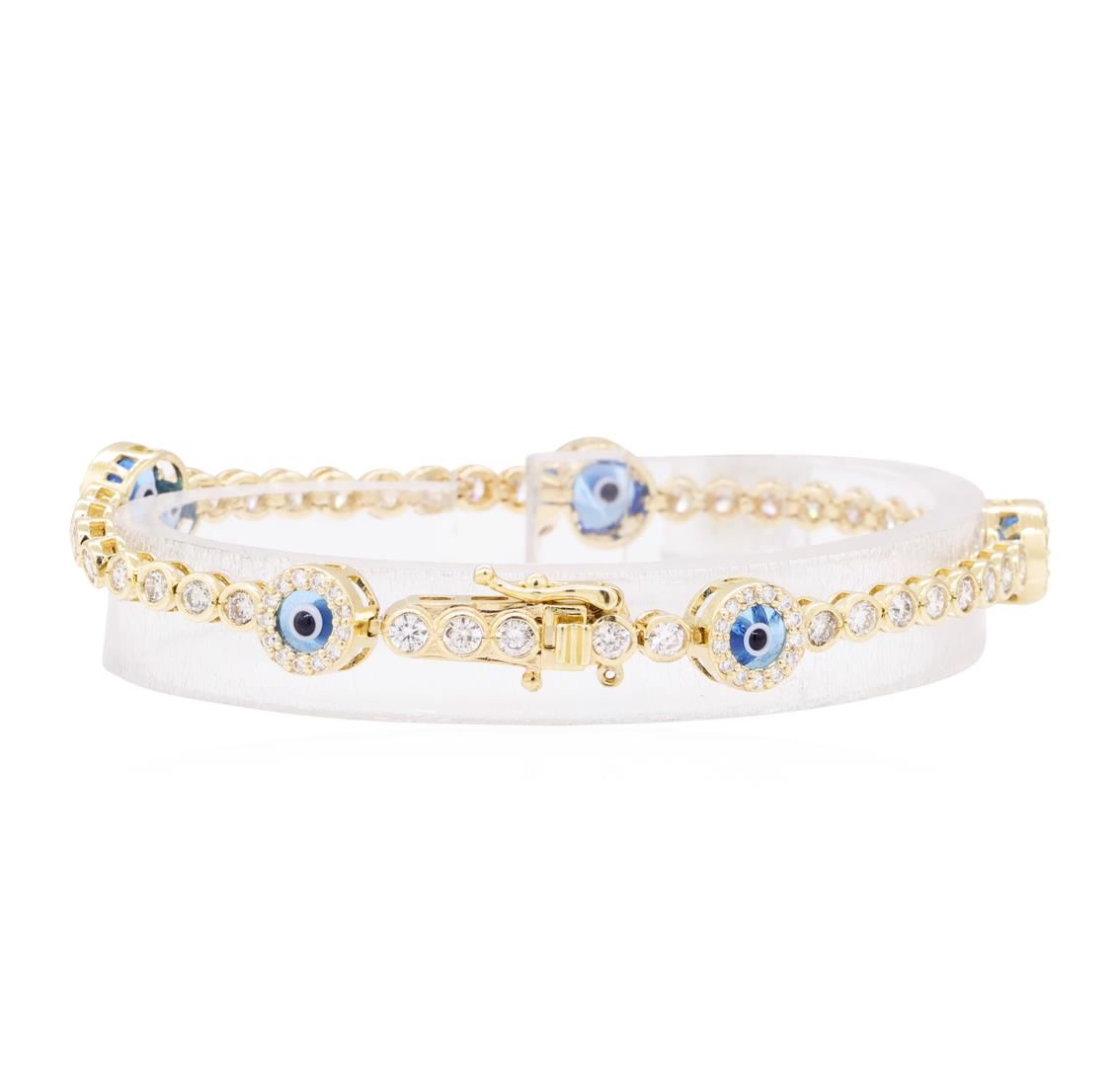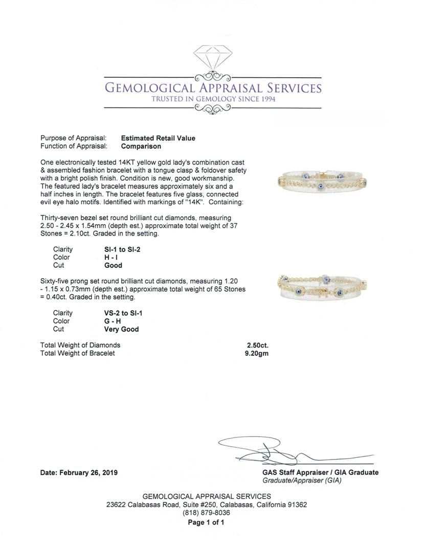 One electronically tested 14KT yellow gold lady's combination cast & assembled fashion bracelet with a tongue clasp & foldover safety with a bright polish finish. The featured lady's bracelet measures approximately six and a half inches in length. The bracelet features five glass, connected evil eye halo motifs. Identified with markings of '14K'. Condition is new, good workmanship. Containing: Thirty-Seven bezel set round brilliant cut diamonds, measuring 2.50 - 2.45 x 1.54mm (depth est.) approximate total weight of 37 Stones = 2.10ct. Graded in the setting. Color H - I, Clarity SI-1 to SI-2 Cut Good Sixty-Five prong set round brilliant cut diamonds, measuring 1.20 - 1.15 x 0.73mm (depth est.) approximate total weight of 65 Stones = 0.40ct. Graded in the setting. Color G - H, Clarity VS-2 to SI-1, Cut Very Good. Total Weight of Diamonds 2.50ct. Total Weight of Bracelet 9.20gm. GAS Appraised.