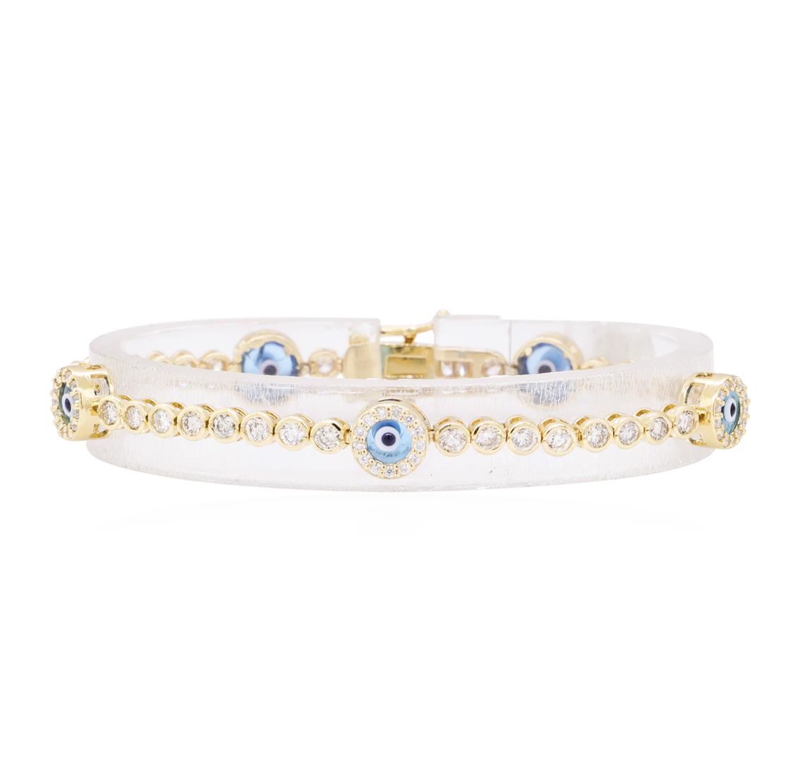 One electronically tested 14KT yellow gold lady's combination cast & assembled fashion bracelet with a tongue clasp & foldover safety with a bright polish finish. The featured lady's bracelet measures approximately six and a half inches in length. The bracelet features five glass, connected evil eye halo motifs. Identified with markings of '14K'. Condition is new, good workmanship. Containing: Thirty-Seven bezel set round brilliant cut diamonds, measuring 2.50 - 2.45 x 1.54mm (depth est.) approximate total weight of 37 Stones = 2.10ct. Graded in the setting. Color H - I, Clarity SI-1 to SI-2 Cut Good Sixty-Five prong set round brilliant cut diamonds, measuring 1.20 - 1.15 x 0.73mm (depth est.) approximate total weight of 65 Stones = 0.40ct. Graded in the setting. Color G - H, Clarity VS-2 to SI-1, Cut Very Good. Total Weight of Diamonds 2.50ct. Total Weight of Bracelet 9.20gm. GAS Appraised.