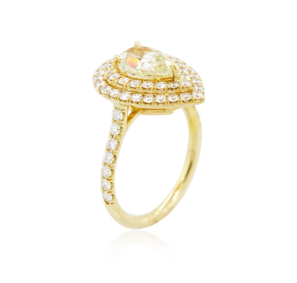 One electronically tested 14KT yellow gold Ladies combination cast & assembled engagement ring with a bright polish finish. Condition is new. Containing: One prong set pear shaped cut diamond, measuring 10.00 x 6.00 x 3.78mm (depth est.) approximate weight of 1.30ct. Clarity: VS-2, Cut is Very Good. Fifty-Seven prong set round brilliant cut diamonds, measuring 1.80 - 1.80 x 1.08mm (depth est.) approximate. Total Weight of 57 Stones = 1.21ct. Clarity: SI-1 to SI-2. Color: I - J, Cut is Good. Total Weight of Diamonds 2.52ct. Total Weight of Ring 6.20 grams. GGL Appraised.