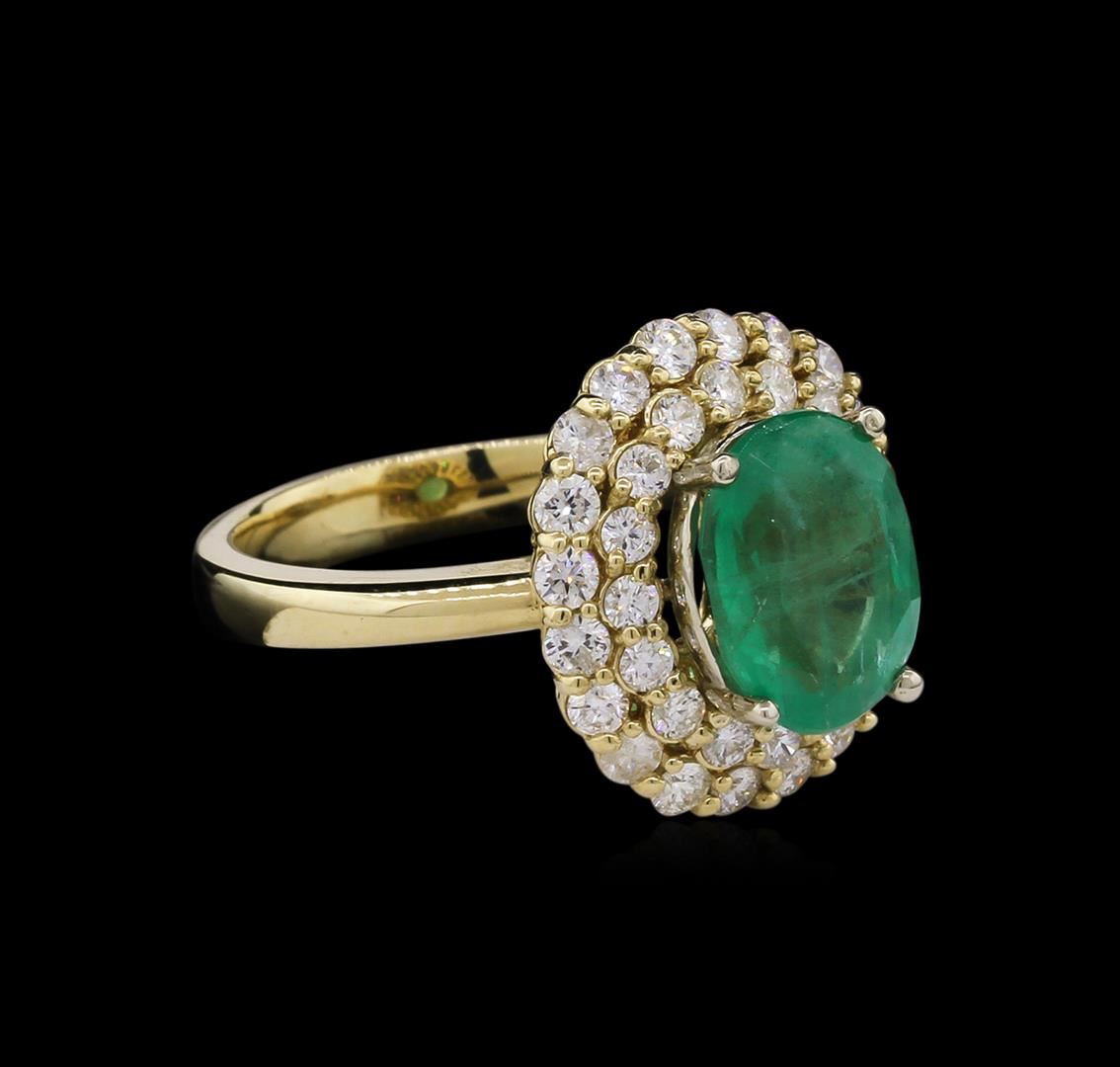 One electronically tested 14KT yellow gold lady's cast fashion ring with a basket double halo with a bright polish finish. The featured lady's ring has a shank measuring 3.15 millimeters wide. Identified with markings of "K14". Condition is new, good workmanship. Containing: One prong set oval modified brilliant cut natural emerald, measuring 10.54 x 8.09 x 4.91mm, 10%. bulge factor, approximate weight of 2.63ct., clarity is heavily included, type III, medium light, very slightly grayish, green color, (GIA G 4/3), cut is good. Naturally occurring internal & external characteristics are present. Indications of oil residue. Colored gemstones are presumed to have been subjected to commonly used enhancement processes. Graded in the setting. Twenty prong set round brilliant cut diamonds, measuring 2.10 - 2.00 x 1.27mm (depth est.) approximate total weight of 20 Stones = 0.66ct. Graded in the setting. Clarity: SI-1 to SI-2 . Color: H - I. Cut Good Sixteen prong set round brilliant cut diamonds, measuring 1.90 - 1.80 x 1.17mm (depth est.) approximate total weight of 16 Stones = 0.39ct. Graded in the setting. Clarity: SI-1 to I-1 . Color: H - I. Cut Good. Total Weight of Colored Stones 2.63ct. Total Weight of Diamonds 1.05ct. Total Weight of Ring 6.60 grams. GAS Appraised.