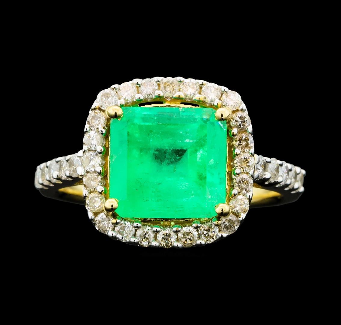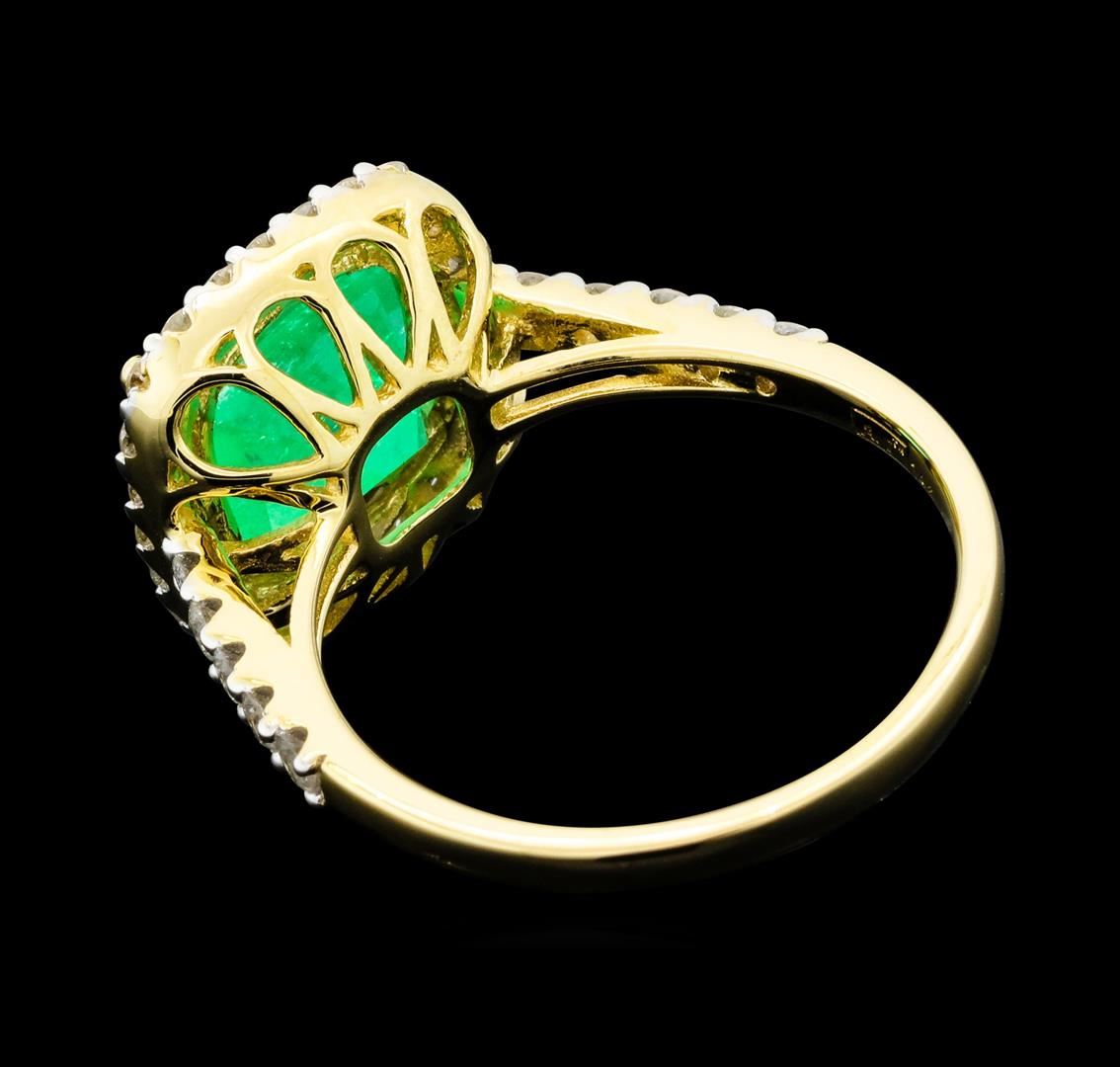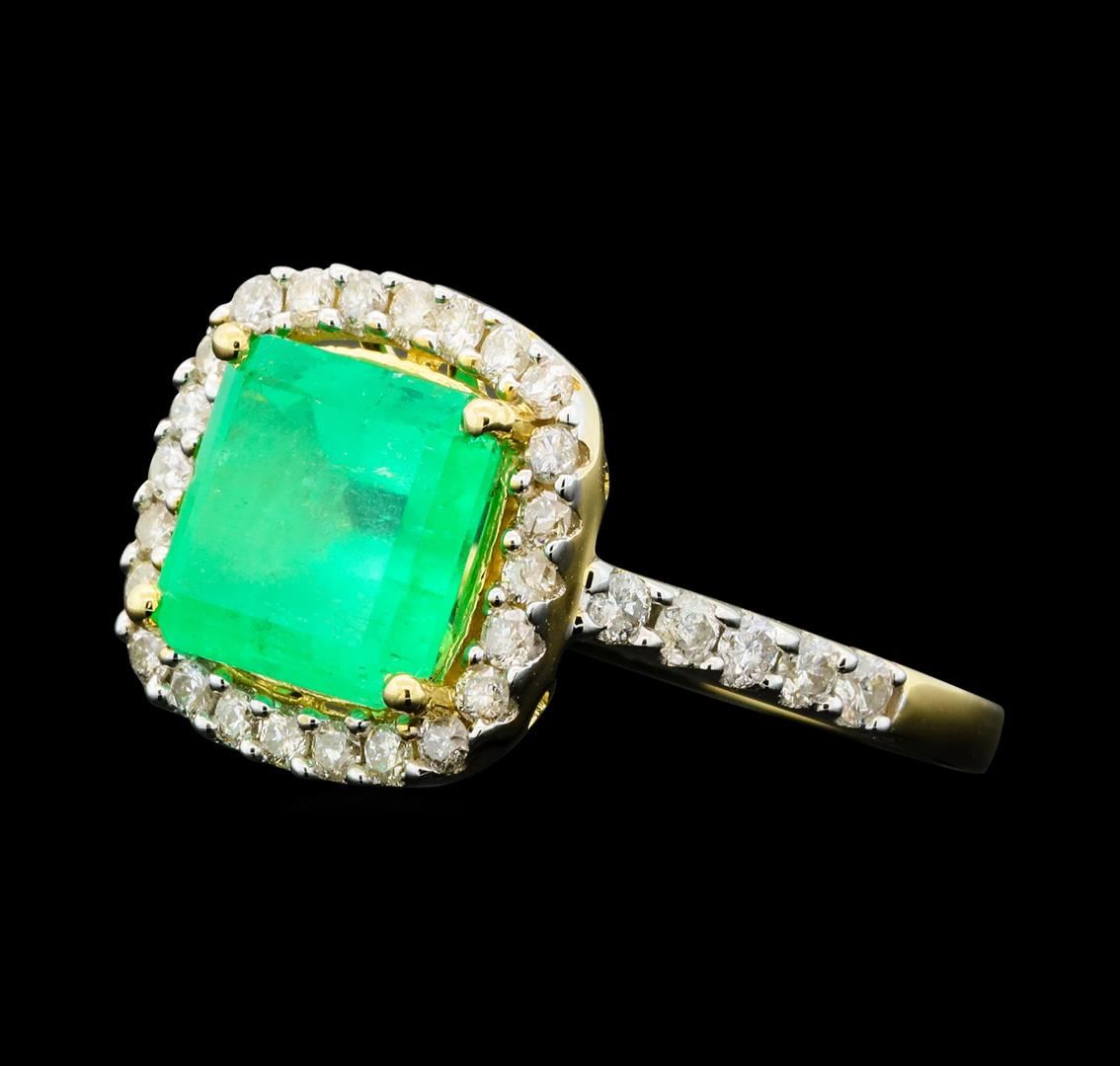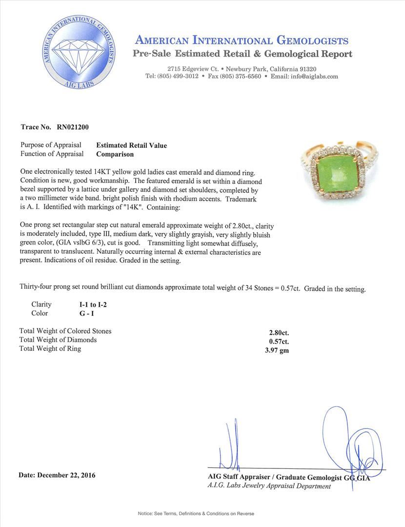 One electronically tested 14KT yellow gold ladies cast emerald and diamond ring. The featured emerald is set within a diamond bezel supported by a lattice under gallery and diamond set shoulders, completed by a two millimeter wide band. bright polish finish with rhodium accents. Trademark is A. I. Identified with markings of "14K". Condition is new, good workmanship. Containing: One prong set rectangular step cut natural emerald approximate weight of 2.80ct., clarity is moderately included, type III, medium dark, very slightly grayish, very slightly bluish green color, (GIA vslbG 6/3), cut is good. Transmitting light somewhat diffusely,transparent to translucent. Naturally occurring internal & external characteristics arepresent. Indications of oil residue. Graded in the setting.Thirty-Four prong set round brilliant cut diamonds approximate total weight of 34 Stones = 0.57ct. Graded in the setting. Clarity: I-1 to I-2. Color: G - I. Total Weight of Colored Stones 2.80ct. Total Weight of Diamonds 0.57ct. Total Weight of Ring 3.97gm. AIG Appraised.